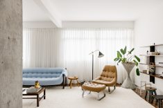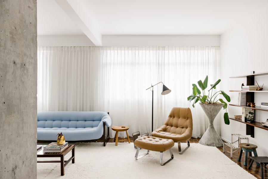 Sobre a base neutra do parquet e das paredes e portas brancas, foram aplicados pontos de cor nas peças de mobiliário mais importantes, como o sofá MP-97 azul e a poltrona e o pufe MP 163 caramelo de Percival Lafer, a poltrona FDC1 cravo de Flavio de Carvalho e a cadeira MTF600 verde de Geraldo de Barros.