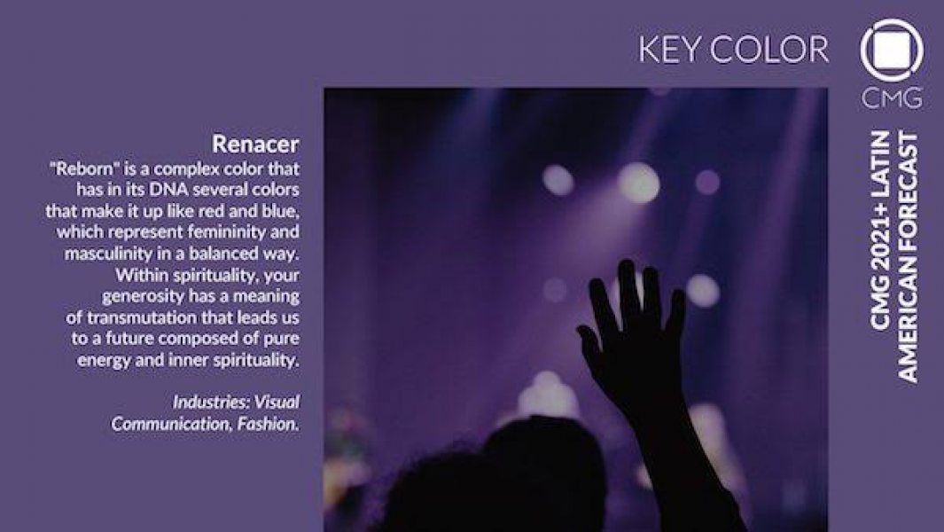 E é com prazer que trago essa novidade para vocês. A cor do ano para America Latina em 2021 do Color Marketing Group, foi nomeada como "Renacer". Um tom de violeta altamente saturado que conecta natureza e espiritualidade. 0 núcleo vermelho e azul de Renacer representa feminilidade e masculinidade e sua alta saturação sugere a energia do movimento para a frente, para novas tempos. Resultado do estudo de vários profissionais e muito do que a minha pesquisa e a do design Leoncio Spencer Pedrosa diziam.