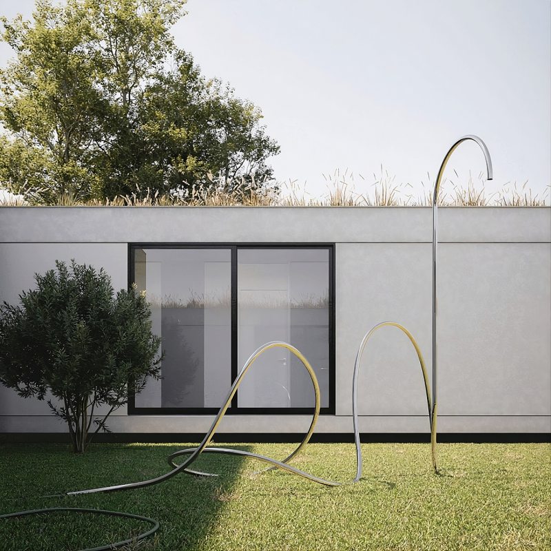 A proposta explora a dimensão lúdica do banho ao ar livre. O objeto lembra o gesto espontâneo de pegar uma mangueira para se refrescar em um dia quente —memória comum em muitas casas de praia ou de campo. A ideia era justamente transformar essa lembrança em peça de design.