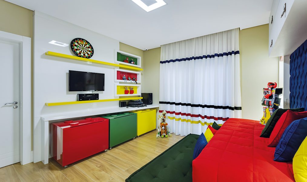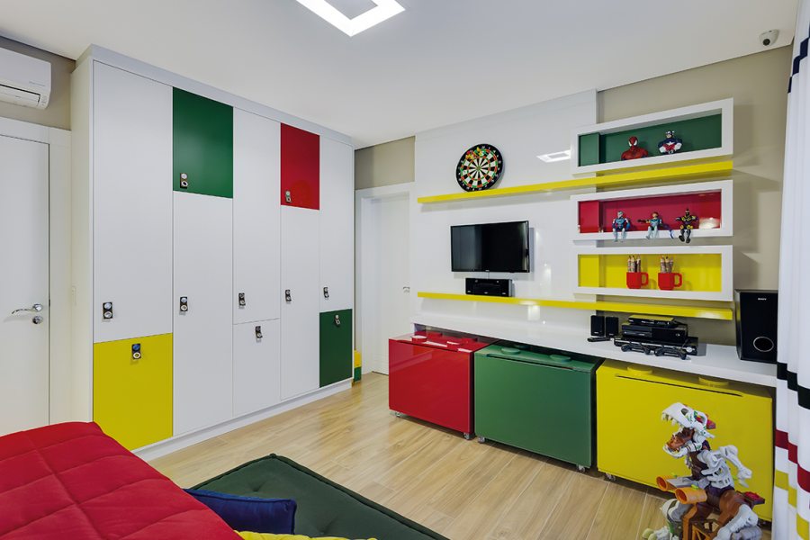 As cores fortes e formatos criativos do LEGO, um dos brinquedos mais conhecidos do mundo, inspiraram a designer de interiores Hellen Giacomitti a criar uma brinquedoteca lúdica para os pequenos moradores. Assim como os famosos blocos de montar, os móveis permitem diferentes configurações e podem ser reorganizados conforme a necessidade.