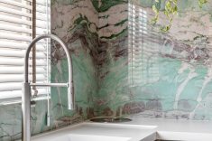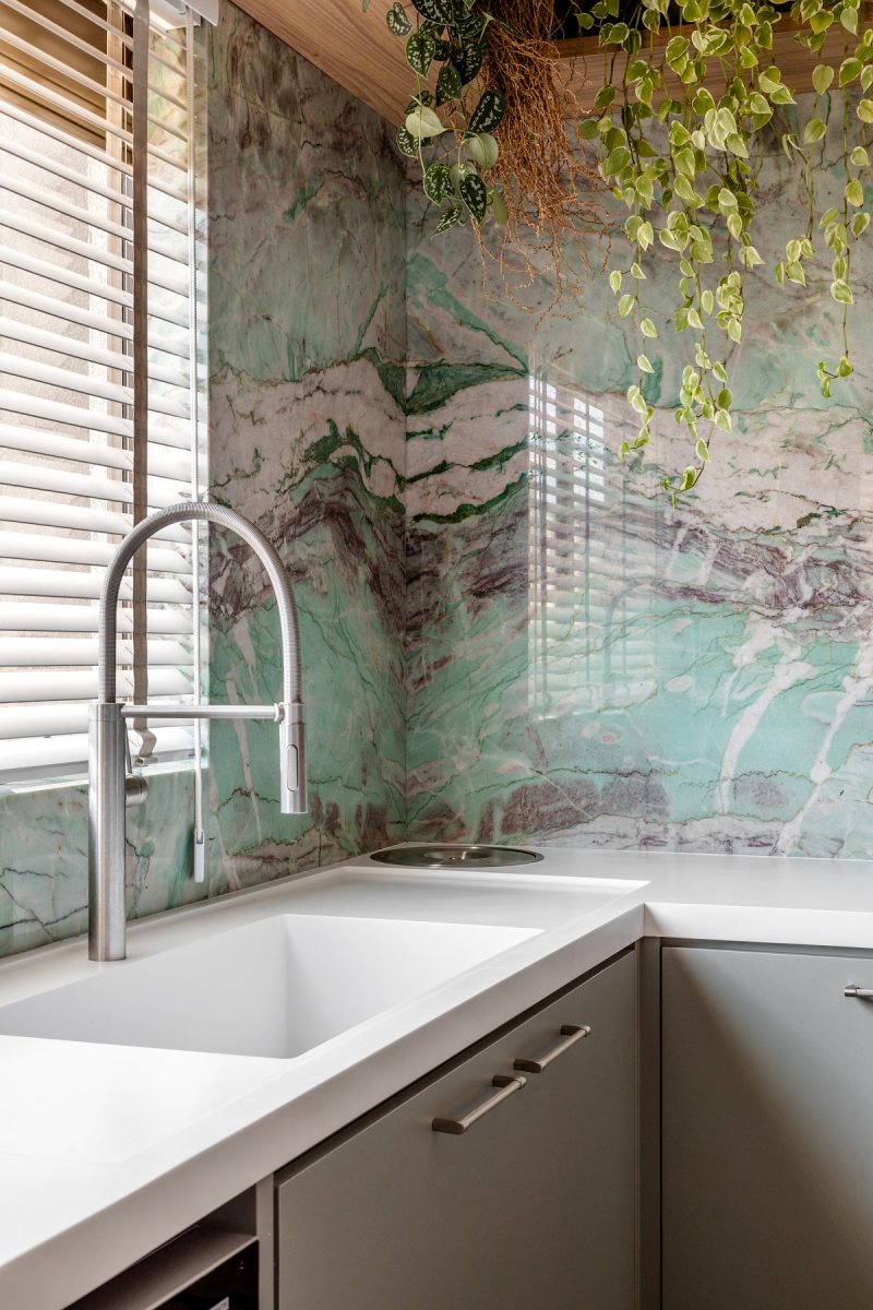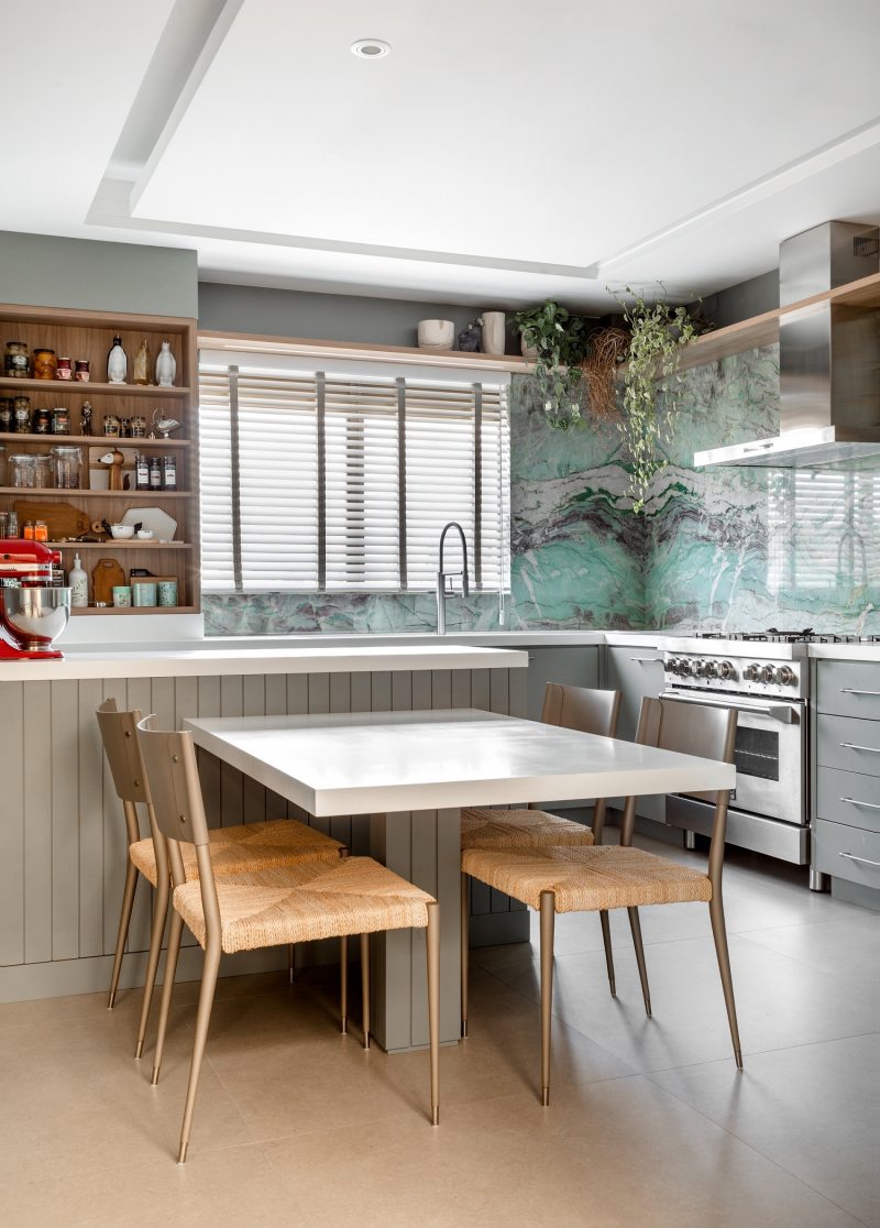 Onde: Curitiba • 23 de Fevereiro - 2023 | Fotos Fabio Jr. SeveroDesigner inova e usa quartzito verde para revestir a cozinha e mostra como ser criativo usando rochas ornamentais brasileiras