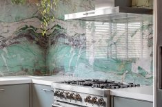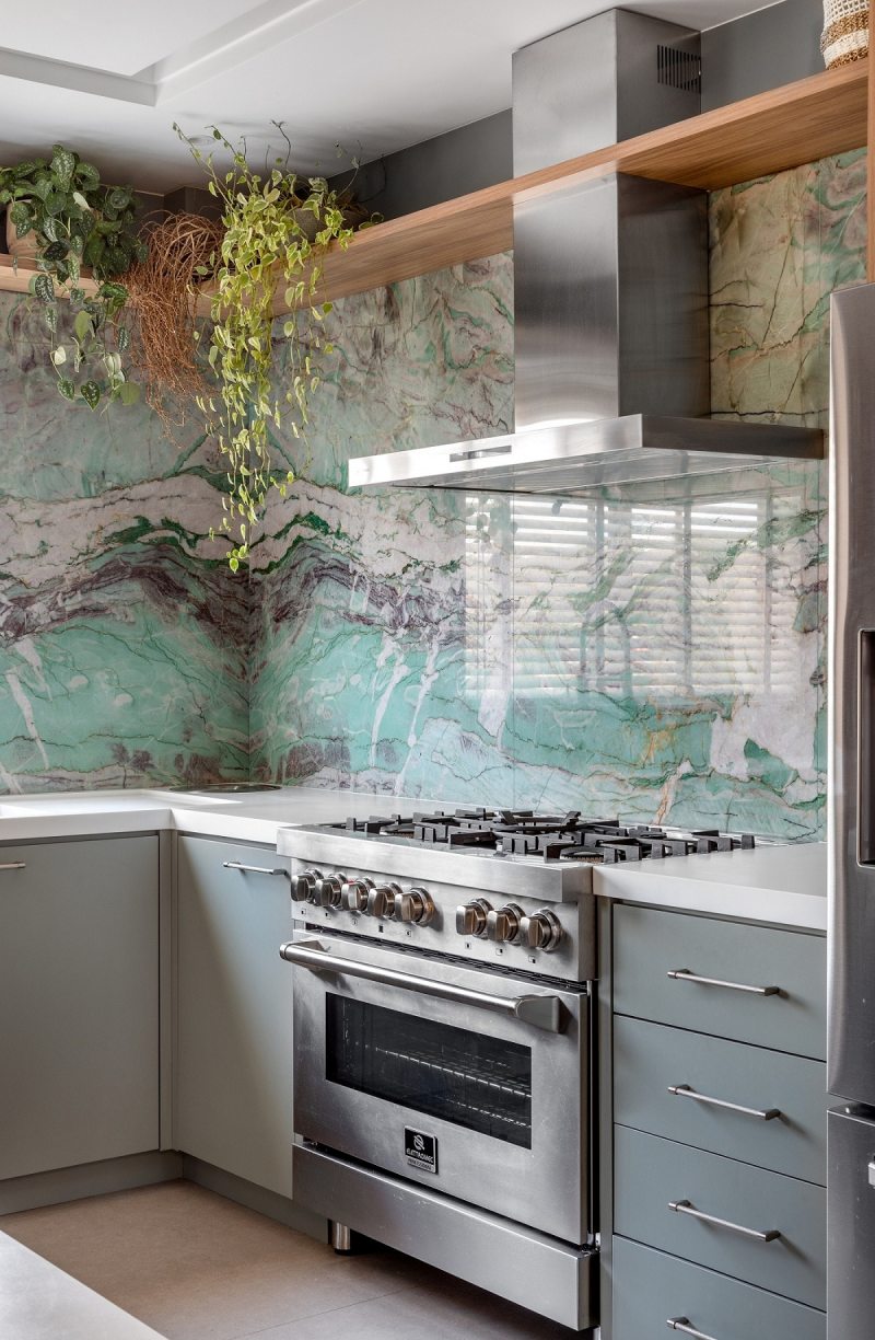 A escolha do designer foi o Quartzito Gaia, da Gramarcal, usado como revestimento na parede de uma cozinha. O projeto mostra como inovar no décor utilizando pedras coloridas e rochas ornamentais incomuns.