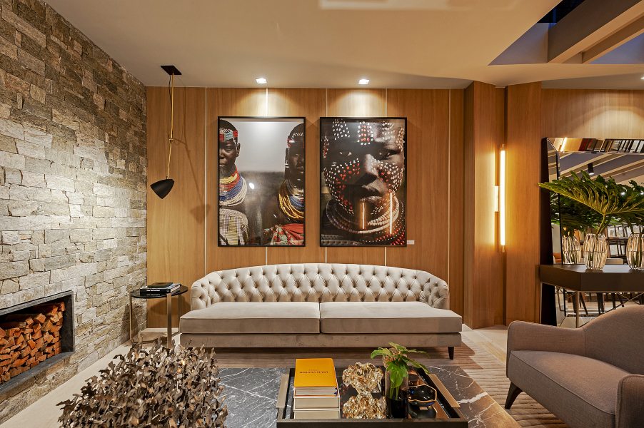 O melhor que a vida tem a oferecer: viagens, momentos divertidos com amigos, bons vinhos e o melhor da gastronomia. Esta foi a inspiração do arquiteto André Bertoluci para o living de 68m² apresentado na Mostra Artefacto de 2019, com apoio da Todeschini. “O espaço, de inspiração masculina, foi pensado para um cliente que gosta de receber pessoas e ter boas conversas sobre viagens, hobbies e outras áreas da vida. A visão e o tato são estimulados por meio da parede de pedra natural em composição com os pendentes de iluminação na frente da lareira, que também aquece o espaço. O paladar tem sua vez na adega, que convida a confraternizações ou mesmo a momentos de relaxamento.” – explica o profissional.