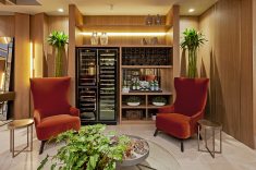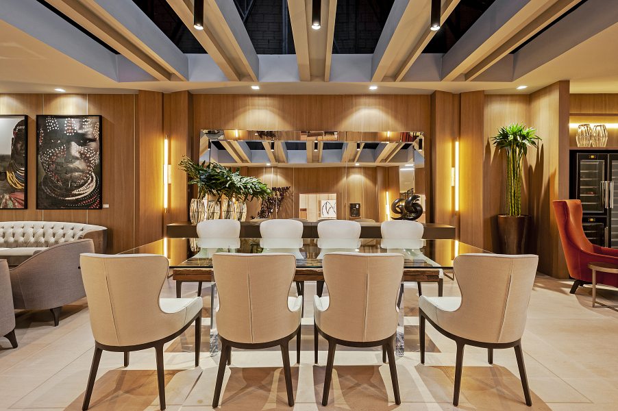 Os tons quentes da madeira (revestimento Forest) garantem a atmosfera convidativa do espaço, especialmente combinados à iluminação incandescente e à iluminação indireta. Obras de arte remetem a viagens e dão toque cosmopolita ao décor, enquanto estofados de veludo complementam o resultado acolhedor. A mesa da sala de jantar é destacada pela claraboia no teto, permitindo receber até oito convidados. A adega convida a degustar bons vinhos e prolongar as conversas com os convidados: tudo para estimular os sentidos e as boas experiências. Confira todas as imagens em nossa galeria!