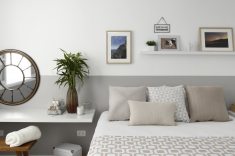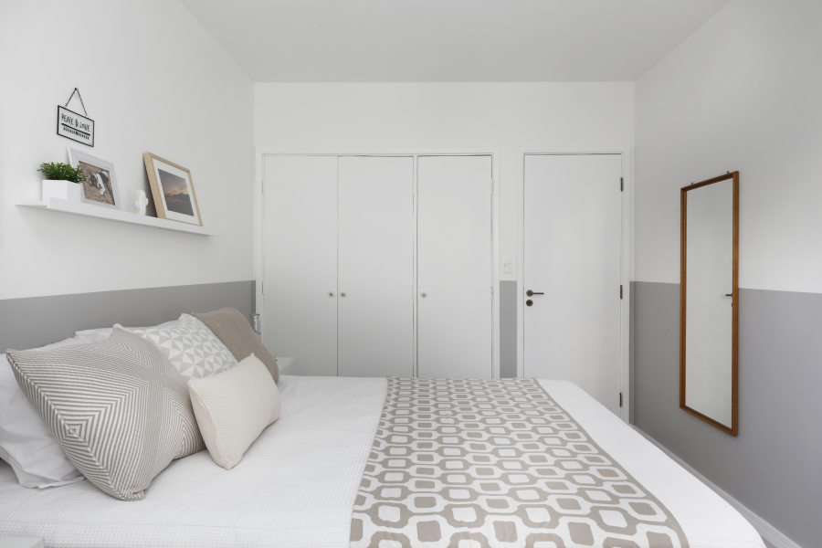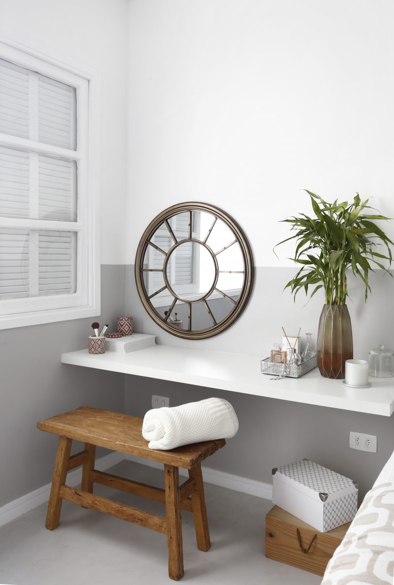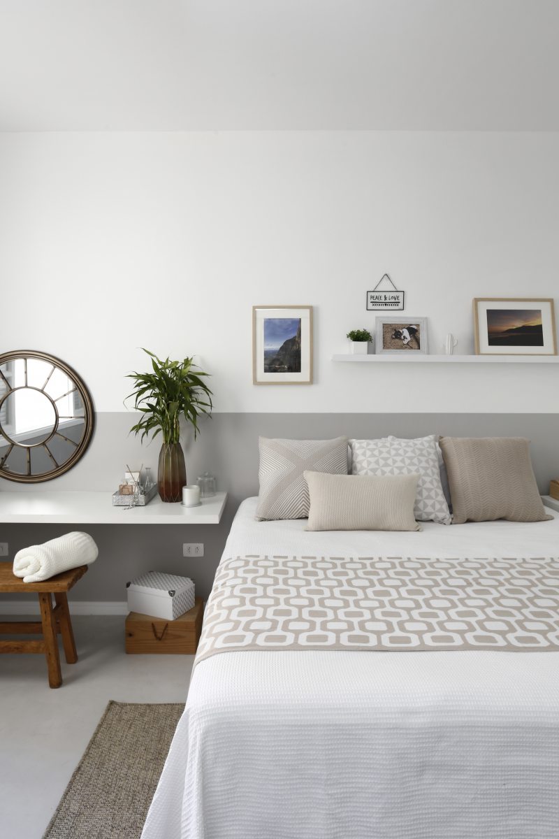 A suíte principal ganhou um clima relaxante com as paredes pintadas de branco e cinza. Sobrou espaço até para uma bancada que serve como penteadeira.