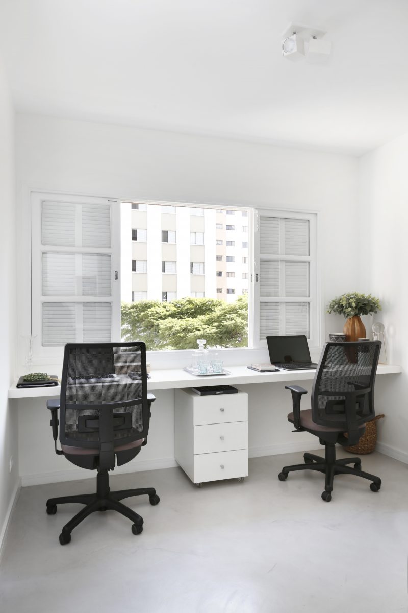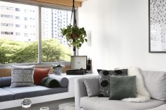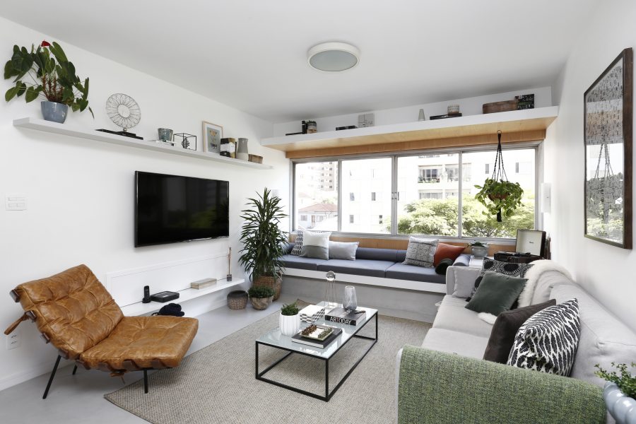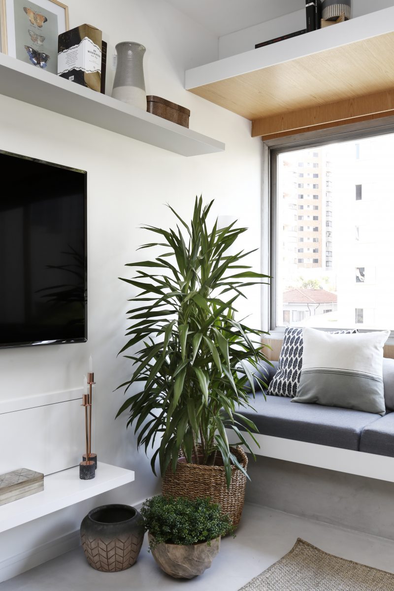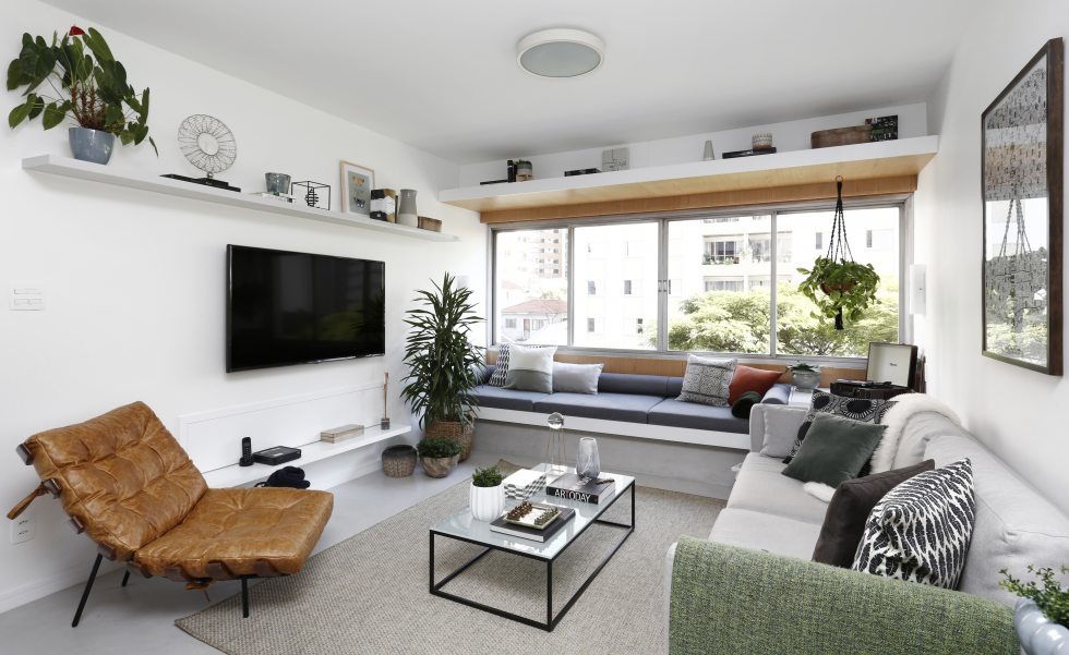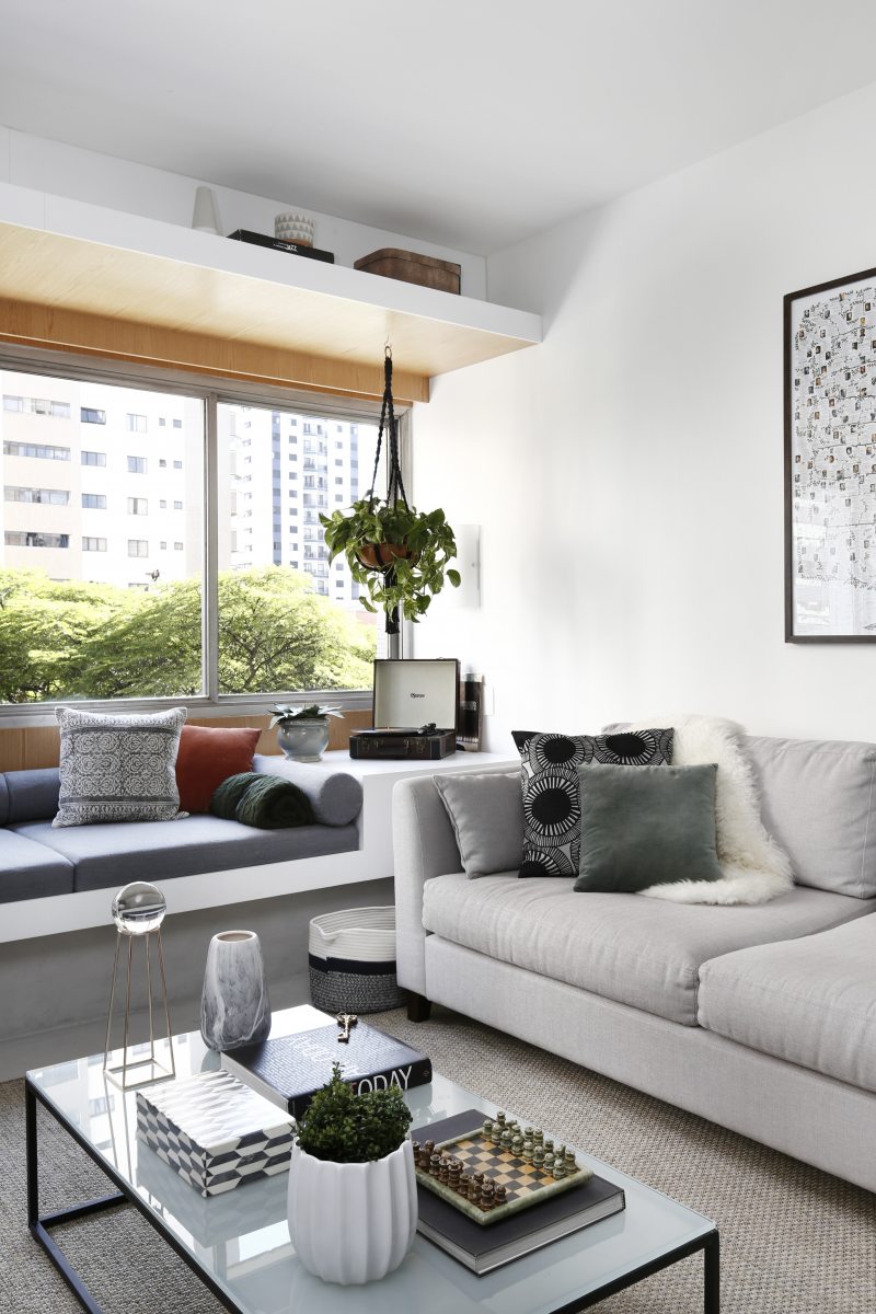 “Gostaríamos de ter uma varanda, mas como não foi possível, resolvemos tirar partido da grande janela”, revela Fernanda Mendonça. Por isso, um banco estofado foi criado para que o casal pudesse receber amigos e curtir a luz natural e a vista para o bairro.