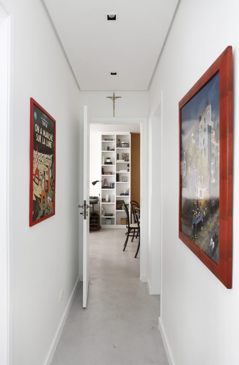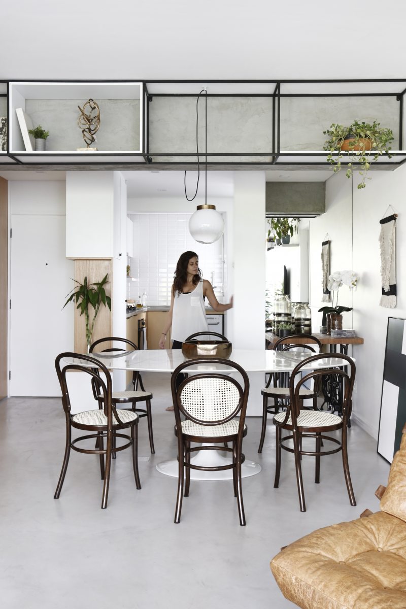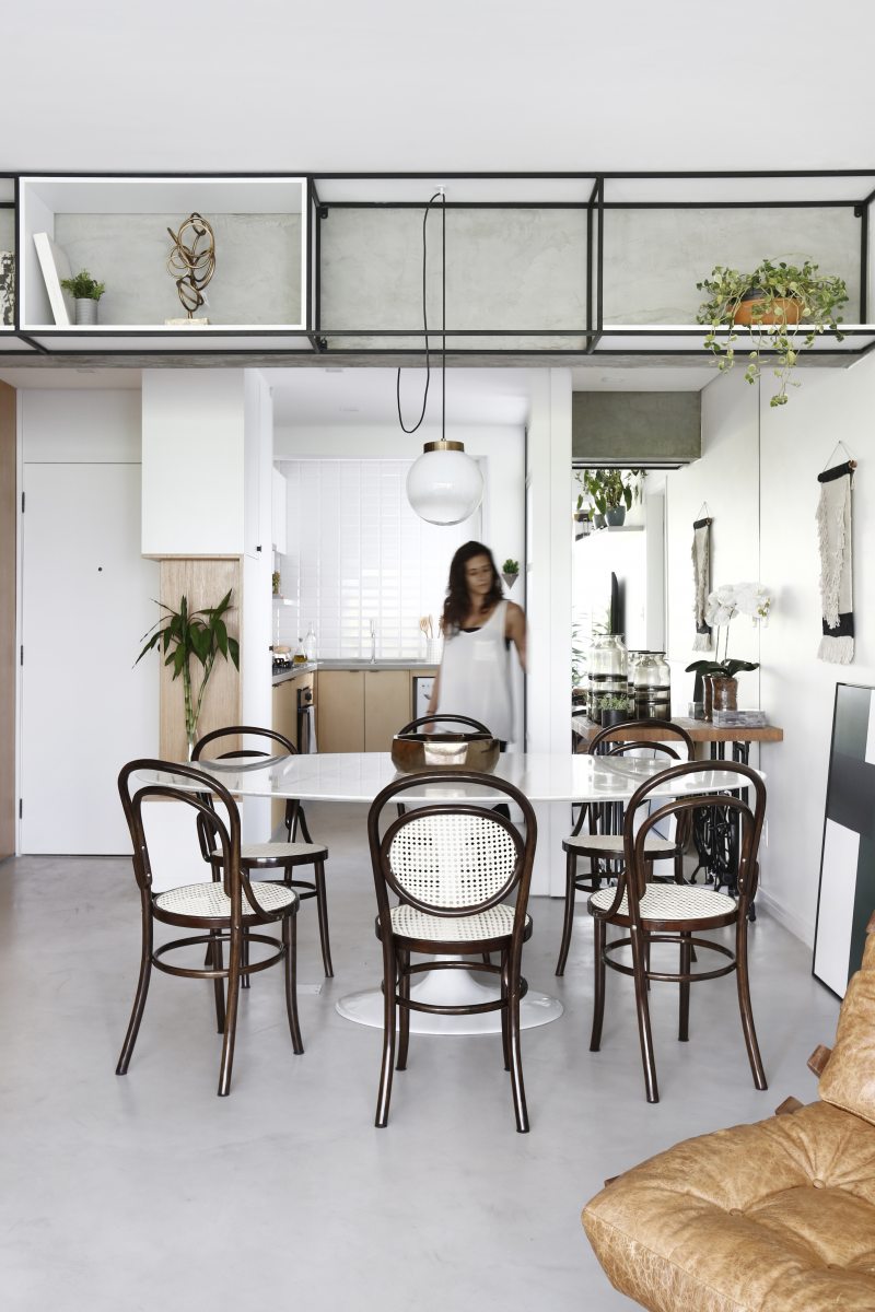 Para dar mais fluidez ao ambiente, algumas paredes precisaram ser derrubadas. A sala de jantar ficou mais ampla e a viga remanescente da antiga divisão, que poderia ser um problema, se transformou em uma estante de cimento queimado e ferro. A opção da mesa de jantar Saarien, no formato oval foi para que pudesse acomodar mais pessoas. As cadeiras vieram do apartamento anterior e foram restauradas.