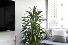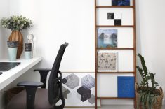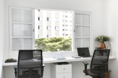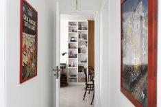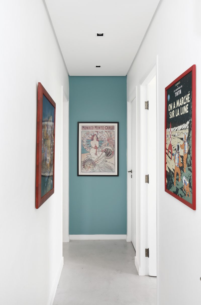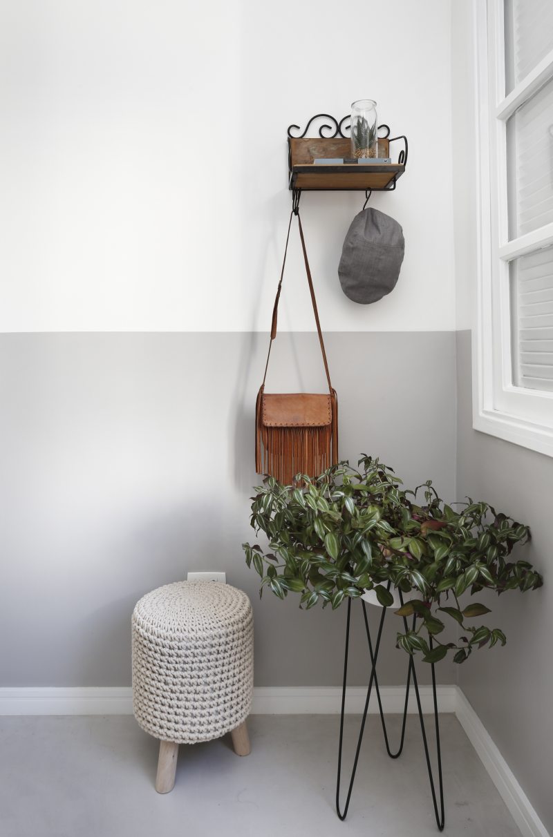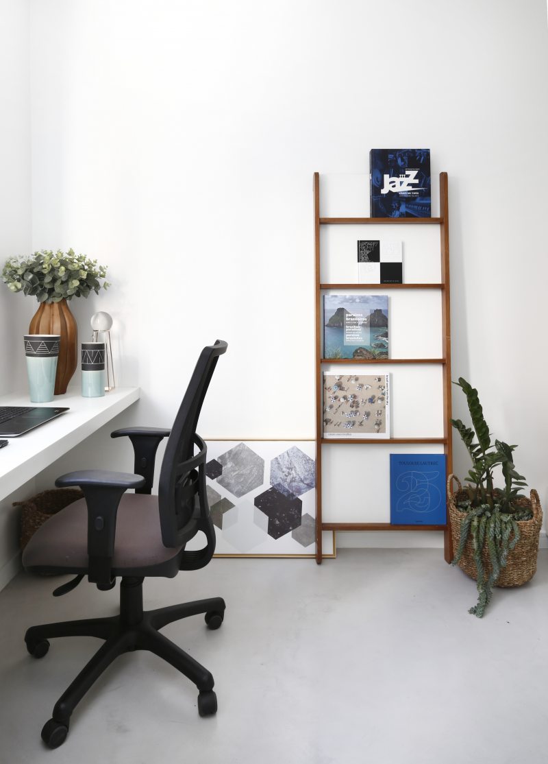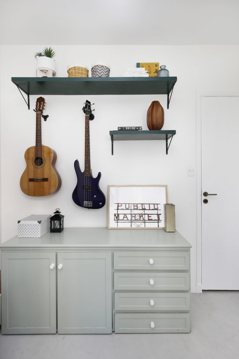 A atual cozinha era um quarto de serviço, que precisou receber em uma das paredes pontos hidráulicos para a torneira e a máquina de lavar louças. Outro quarto do apartamento foi transformado em uma home office. Para aproveitar o máximo da iluminação natural a bancada de trabalho foi colocada bem pertinho da janela. Fernanda que adora repaginar peças e dar uma nova cara para elas, reformou uma antiga cômoda que a acompanha desde criança, ela também utilizou uma porta de madeira maciça e a transformou em duas prateleiras. O baixo e o violão são o hobby do namorado que também fazem parte da decoração.