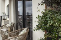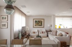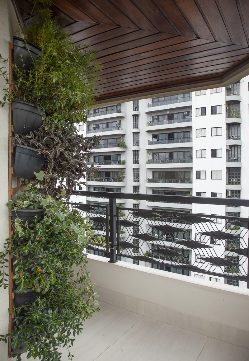 Para a varanda, Carina implementou soluções simples e que proporcionaram um espaço de descanso para os moradores. Para contemplarem a vista privilegiada, o espaço não foi fechado com vidros ou telas. A varanda também recebeu duas poltronas com material próprio para a área externa – aqui, eles vivenciam o encontro direto com o frescor da natureza sem sair da cidade!