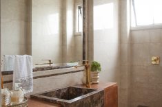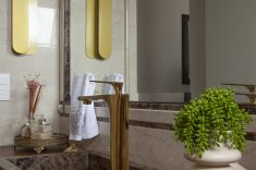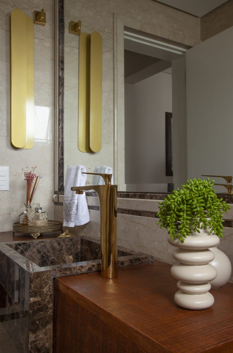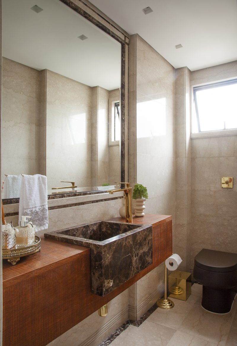 Atenção aos pequenos detalhes incrementam, com muito êxito, o projeto! Equilibrando o ar clássico trazido pelos tons dourados dos metais, a arquiteta acentuou a modernidade por meio de uma bacia sanitária marrom com acabamento matte e a execução de um lavatório em madeira de demolição e cuba de sem encaixe em mármore Marrom Imperial. A perfeita união do clássico com toques modernos se fez presente nesse lavabo. O ambiente, assim como a sala de estar, já era todo revestido com um mármore importado de alta qualidade e em perfeito estado. Por isso, a arquiteta decidiu por mantê-lo e acrescentar apenas as louças, acessórios e trocar o lavatório. Além dos metais em dourado, o grande destaque está na bancada da pia, composta pela combinação entre a madeira de demolição e a cuba de semi-encaixe esculpida em mármore.
