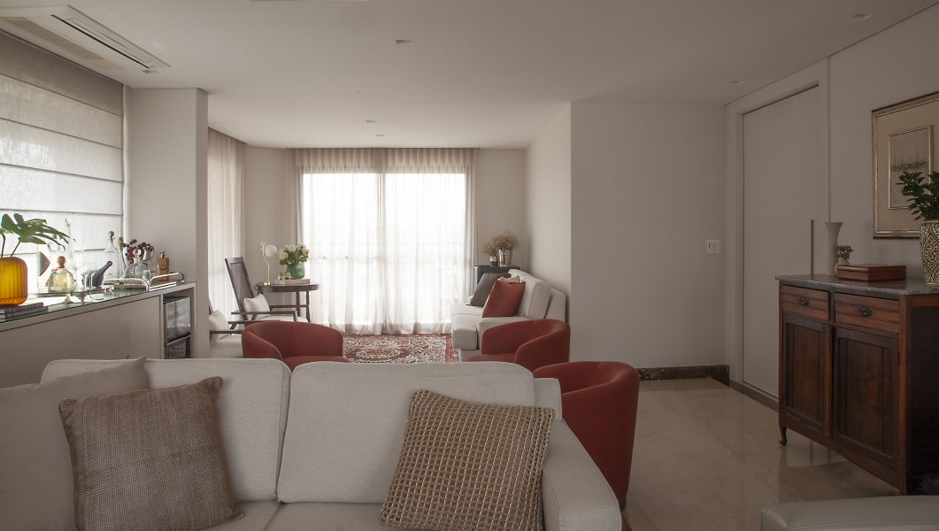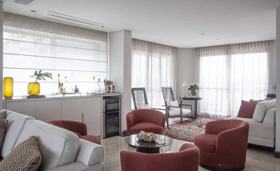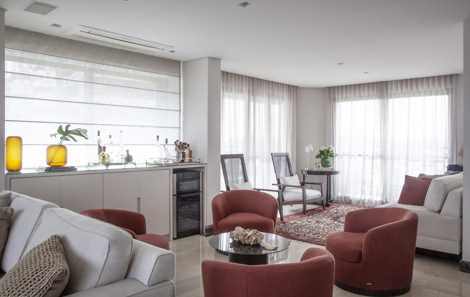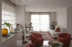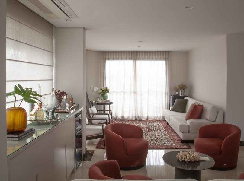 Com o desejo dos clientes em ter o living integrado, Carina pensou em uma solução que possibilitasse a recepção de convidados com o máximo de conforto. Para isso, a arquiteta montou este lounge bem em frente à porta da área social com poltronas giratórias – um verdadeiro chamado para permanecer com as pessoas queridas em longos bate-papos. Dividindo a mesma área, a profissional planejou e desenhou um móvel que faz as vezes de bar e armazena tudo com a máxima descrição e funcionalidade. Super alinhada ao estilo e necessidade da família, a peça ficará por ali por muitos anos. "Uma outra forma de ressignificar móveis usados ou antigos é pintá-los. Muitas vezes, a simples aplicação de verniz, seja ele fosco ou brilhoso, já é capaz de dar à peça uma nova vida. A troca de puxadores também é bastante recorrente para renovar armários, cômodas ou mesas de todas as formas", conta Carina.