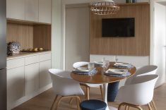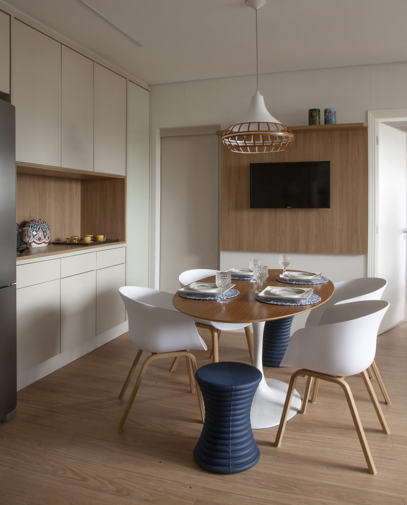 Com a proposta de aquecer o ambiente e oferecer aos moradores mais uma opção de local para reunir a família ao redor da mesa, a cozinha também passou a contar com uma mesa de seis lugares. "Com o mix de bancos e cadeiras, conseguimos aliar a modernidade ao estilo clássico dos clientes", afirmou a arquiteta.