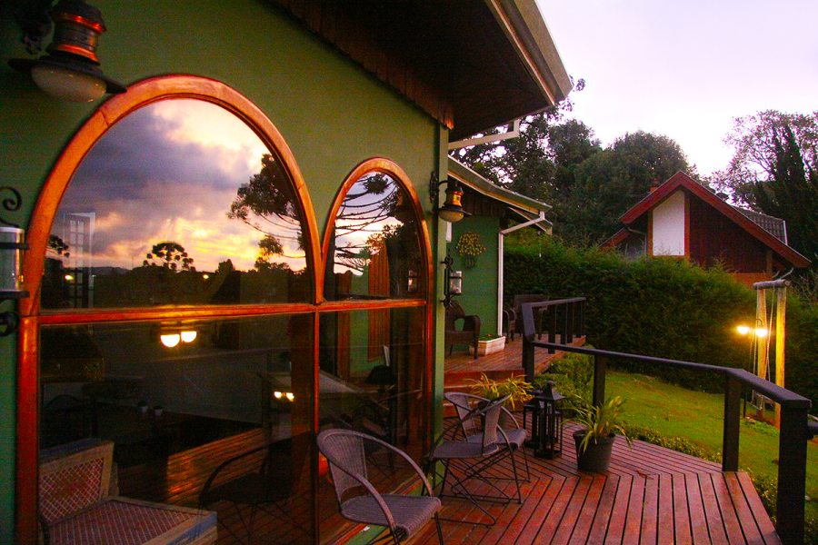 As cabanas do Reserva Santo Antônio têm lareira, hidromassagem, sauna e pequenos decks voltados para o horizonte. O desenho das unidades favorece a sensação de abrigo: madeira aparente, iluminação baixa, volumes compactos e a presença constante da vegetação. A experiência romântica vem do encontro entre paisagem e interior, não de excessos decorativos.
