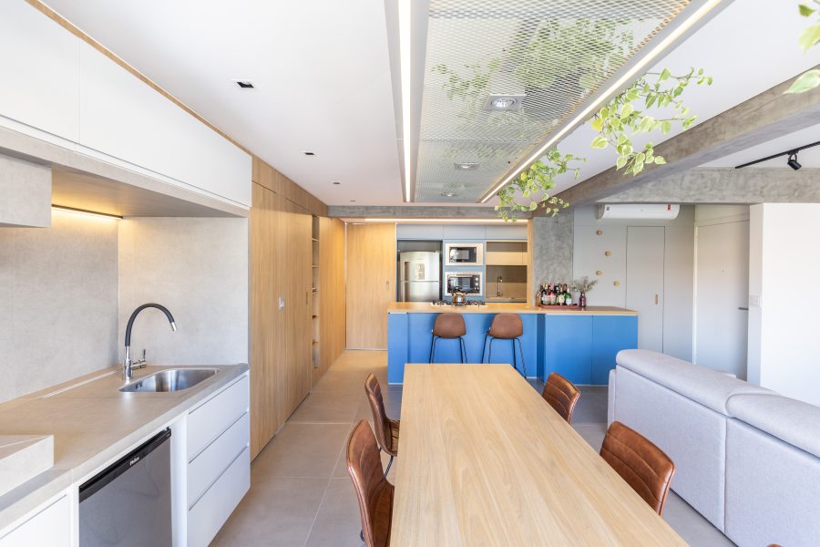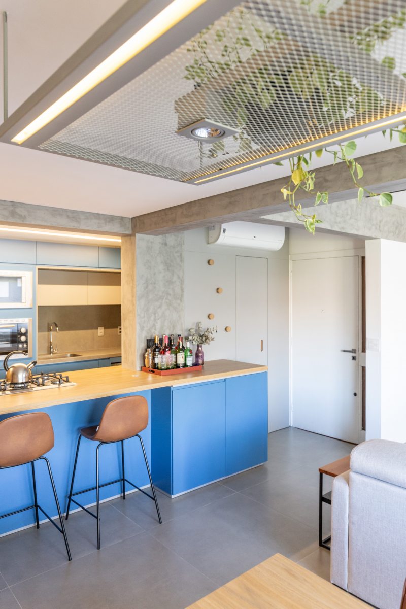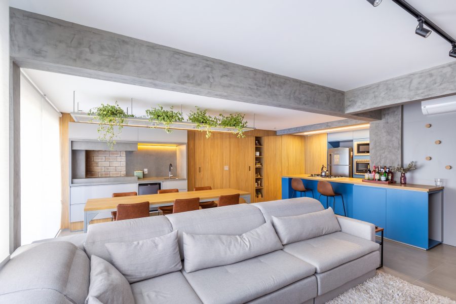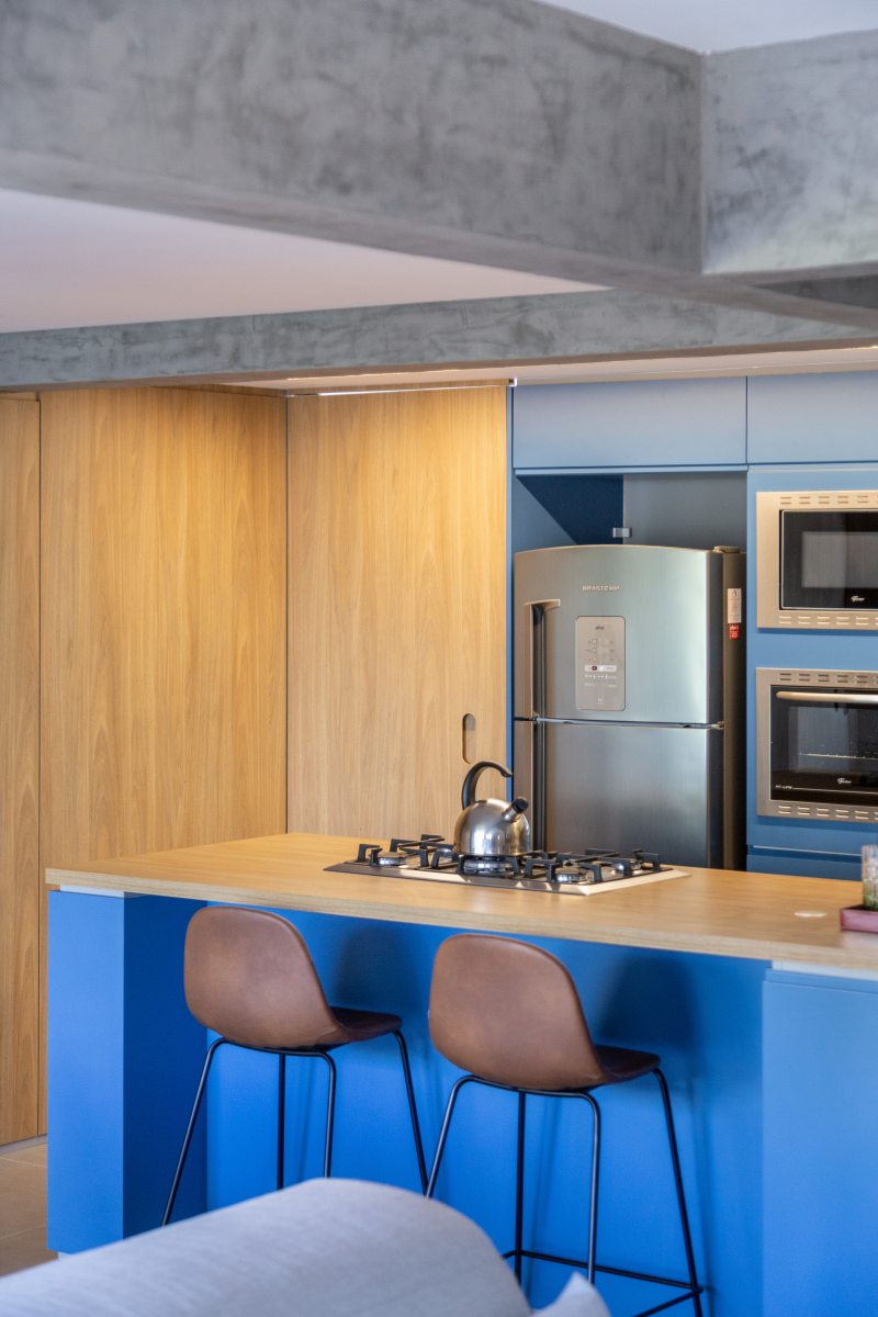 A antiga sala de estar, com área rebaixada e vão para lareira, deu lugar a uma ampla área de convivência com sala de estar, cozinha, churrasqueira e sala de jantar. A bancada azul vibrante da cozinha, combinada ao piso e às vigas de cimento queimado, conferiu aspecto ainda mais atual ao décor. Na cozinha, apesar do espaço reduzido, a bancada generosa e o aproveitamento dos móveis sob medida permitiu acomodar torre de fornos, geladeira, cuba e despensa de mantimentos em um espaço totalmente funcional.