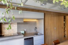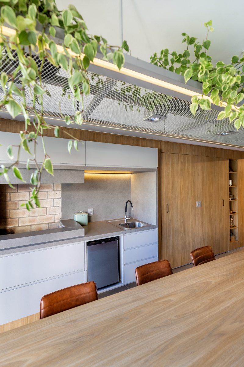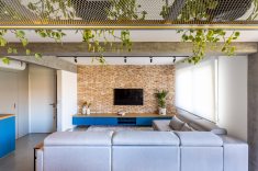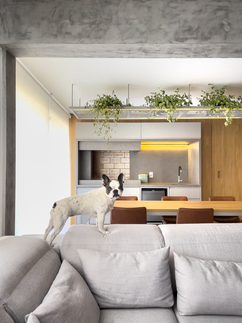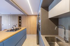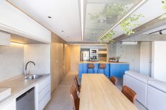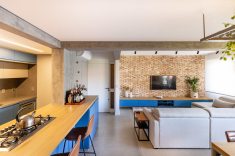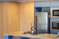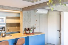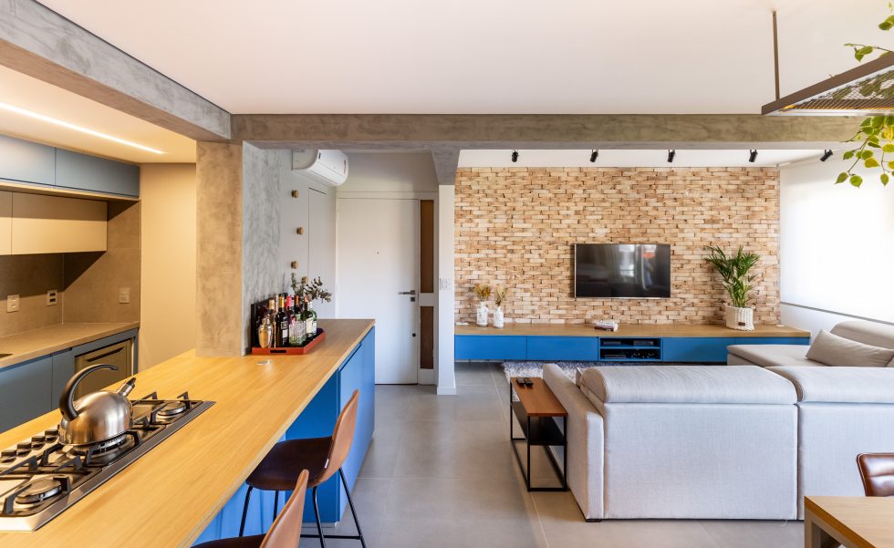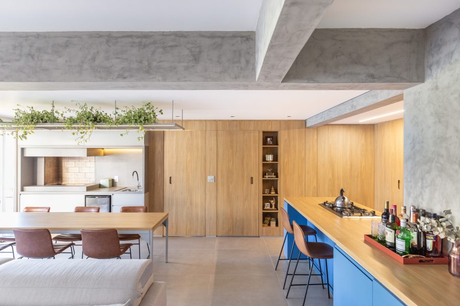 A antiga sala de estar, com área rebaixada e vão para lareira, deu lugar a uma ampla área de convivência com sala de estar, cozinha, churrasqueira e sala de jantar. A bancada azul vibrante da cozinha, combinada ao piso e às vigas de cimento queimado, conferiu aspecto ainda mais atual ao décor. Na cozinha, apesar do espaço reduzido, a bancada generosa e o aproveitamento dos móveis sob medida permitiu acomodar torre de fornos, geladeira, cuba e despensa de mantimentos em um espaço totalmente funcional.