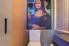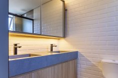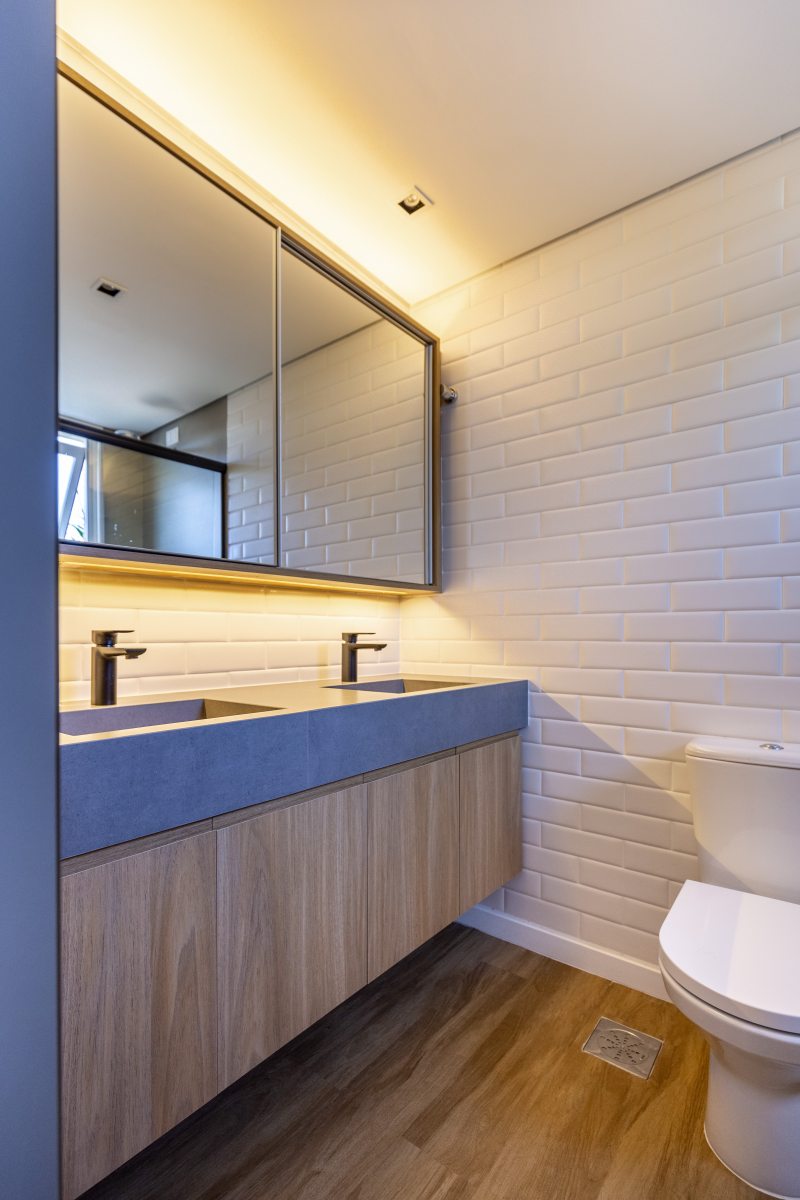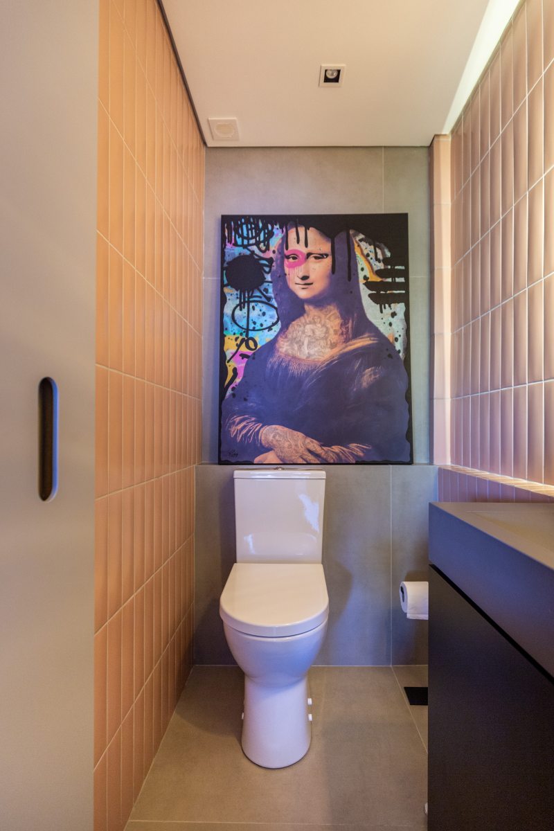No extremo oposto, a sala de jantar, posicionada entre a churrasqueira e a sala de estar, substituiu uma antiga sala de estar rebaixada, com lareira, que prejudicava o fluxo desimpedido da área social. Após o nivelamento do piso, a lareira foi convertida em churrasqueira e ganhou uma área de apoio para reuniões com amigos e familiares. Ao lado da entrada principal, o lavabo com mobiliário minimalista e intervenções gráficas, serviu também para delimitar o home office adjacente, camuflado atrás de um painel de madeira clara com estante. Todas essas soluções atenderam ao programa de necessidades da família e, de quebra, transformaram o imóvel em um excelente investimento. Mudanças, quando positivas, sempre são bem-vindas.
