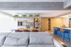 O jovem casal de clientes, esperando seu primeiro bebê, precisava de ambientes funcionais e espaçosos, que atendessem às necessidades da família em expansão. Para isso, os profissionais substituíram as dependências de serviço, que ocupavam quase 25% da área disponível do imóvel, por uma nova área social com layout integrado e décor contemporâneo. Ao lado da entrada principal, o lavabo e o home office apostaram em uma identidade visual completamente nova, com paleta de cores saturada e painéis de madeira clara.