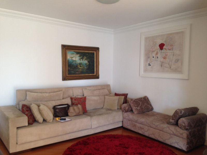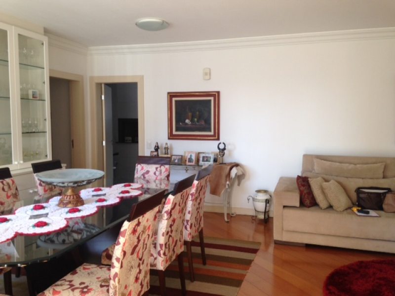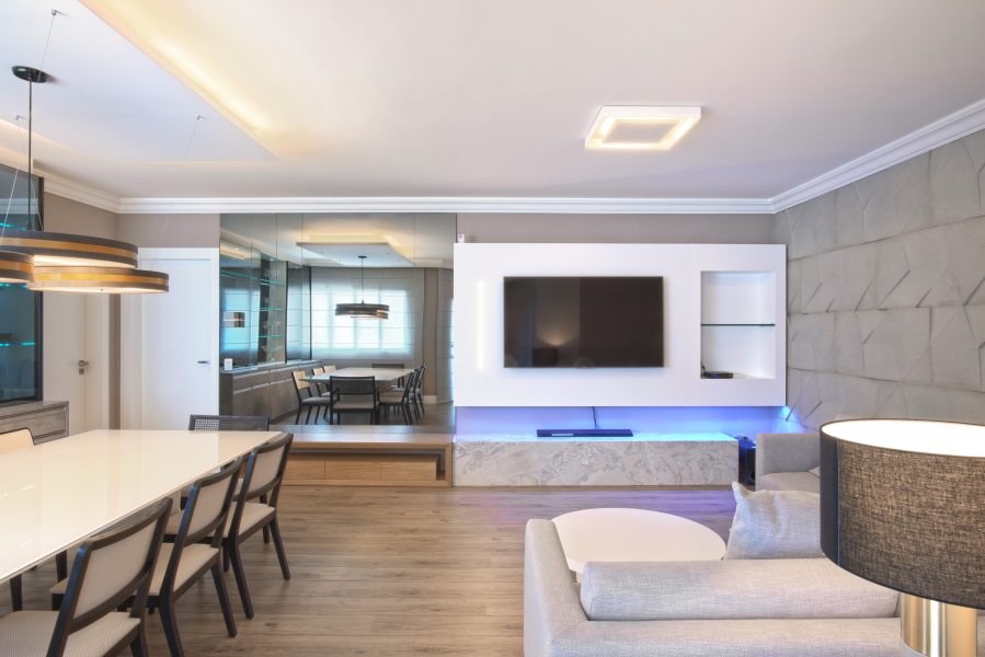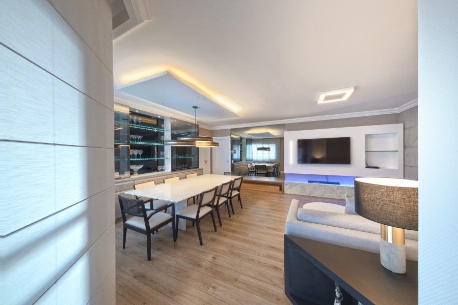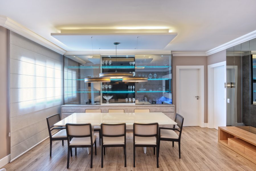 Na sala de jantar, integrada com home theater, a antiga cristaleira ganhou nova roupagem, com prateleiras de vidro iluminadas por fitas de LED e portas de correr. Acima da mesa de jantar, a designer criou um volume em gesso para receber o pendente triplo Klaxon.