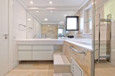 A antiga banheira foi substituída por um ofurô de jatos duplos, com iluminação cromoterápica. Para prevenir acidentes, barras de segurança e materiais antiderrapantes foram inseridos estrategicamente no banheiro.