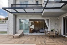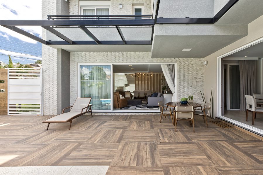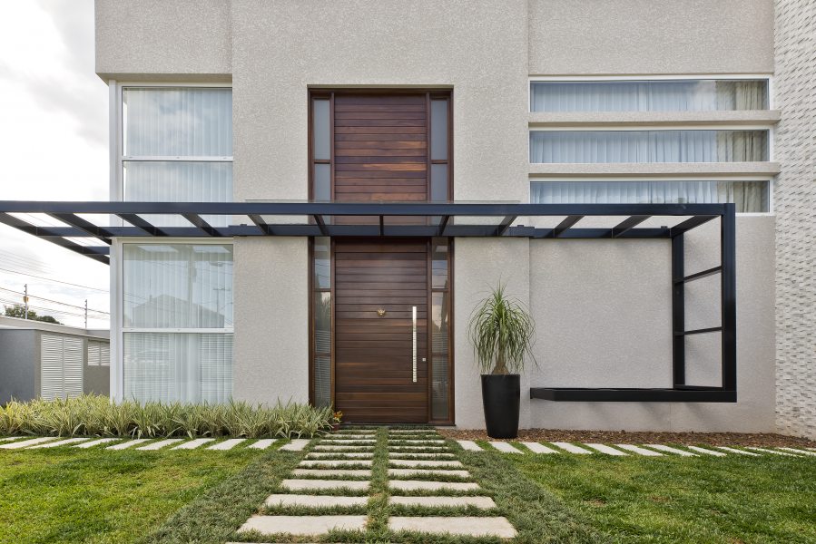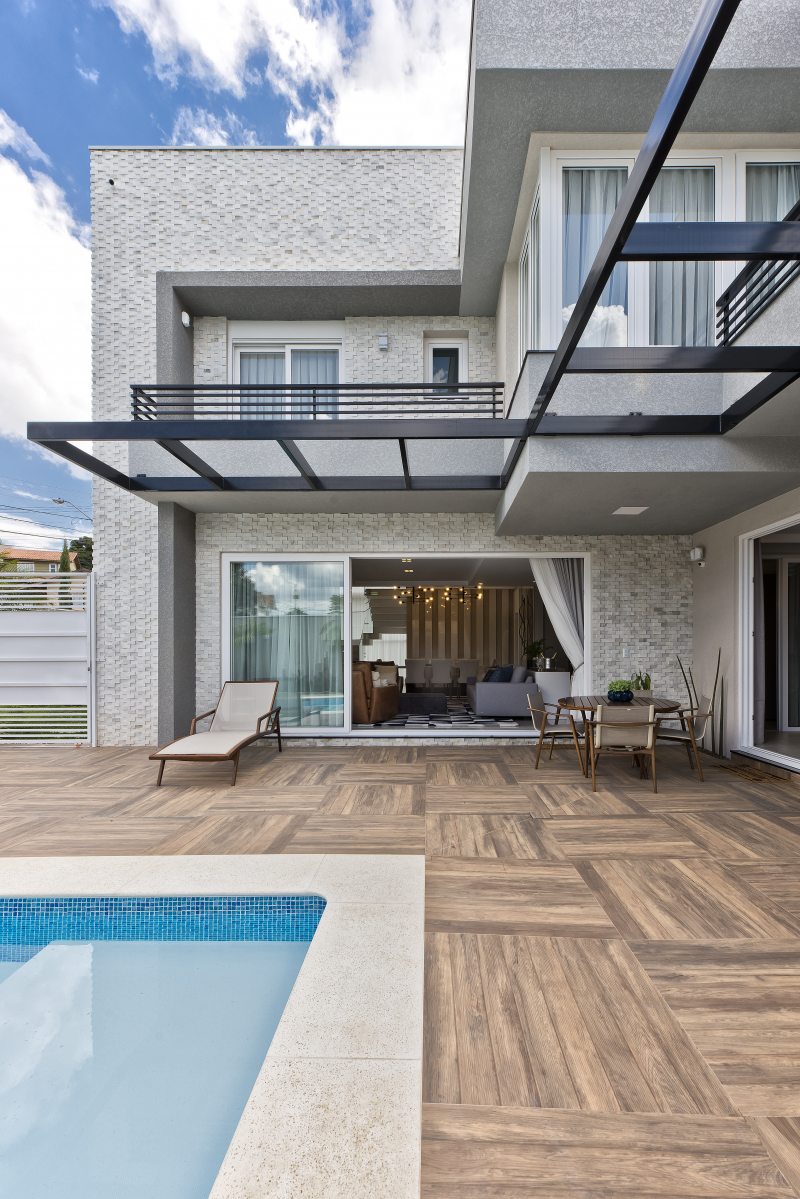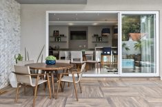 casas, tornou-se uma residência de 300 m² com amplo jardim. “Procurei criar um projeto contemporâneo, com linhas retas, que valorizasse a natureza”, conta a arquiteta Mariana Paula Souza, que assina o espaço. Do lado de dentro, porcelanato de grande formato, madeira, espelhos e detalhes combinando com a paleta de cores neutras, com toques azul. Para o arquitetônico, pinturas texturizadas e revestimentos com pedras, além de esquadrias em PVC da Weiku: “Optei pela Weiku pela qualidade e durabilidade do material. As esquadrias de PVC com vidro duplo geram excelente conforto térmico e acústico para a casa. Além disso, a Weiku auxilia na especificação dos produtos corretos, para melhor aproveitamento de vãos, indicando tamanhos de janela que dessem ao cliente um melhor custo benefício, além de executar os serviços com qualidade e comprometimento”, elogia Mariana.