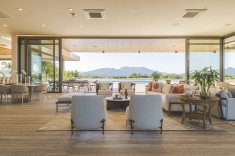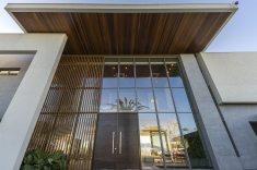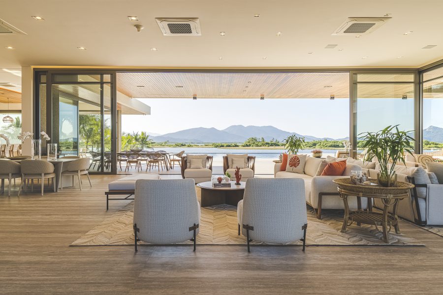 A fim de incorporar as vistas privilegiadas para a paisagem do entorno o projeto utilizou vidro em boa parte da fachada, encarregando o escritório de arquitetura Olesko & Lorusso do décor de interiores. Esquadrias e portas-janela de PVC de alto desempenho garantiram o conforto térmico e acústico, possibilitando, de quebra, a abertura total para integrar por completo os ambientes internos e externos. Brises verticais e elementos amadeirados deixaram o resultado mais acolhedor, trazendo a atmosfera “residencial” desejada pelos moradores, complementada pelo mobiliário elegante e elementos decorativos modernos escolhidos a dedo pelo escritório de arquitetura.