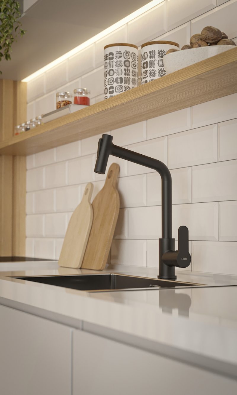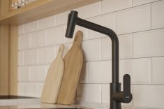 Ademais, sua bica é móvel e extraível, facilitando o uso nas atividades diárias e economizando água por meio de um arejador que reduz o consumo em até 50%. Já os monocomandos da Linha Prática e Kitchen (foto acima) completam o portfólio dedicado a cozinhas com novas opções de acessórios e acabamentos também na versão preto matte.