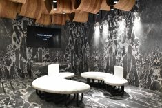 Na Expo Revestir o Mármore Branco Michelangelo Prime® e o Mármore Grigio Michelangelo® foram aplicados de formas contrastantes em pisos, paredes e até nos móveis: os Sofás Duo de Mármore Branco Michelangelo Prime® garantiram estética singular ao ambiente, contrastando com o teto de palha tramada criado por Ana Penso.