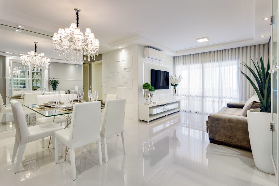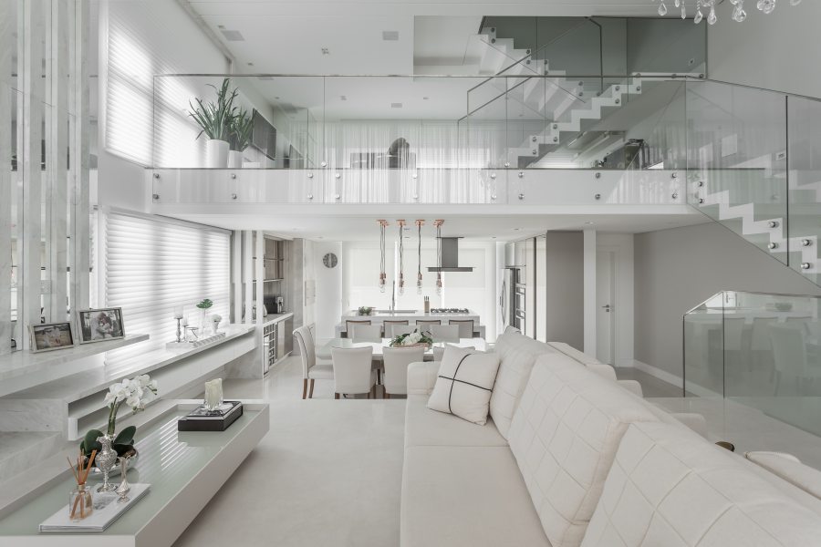 O branco em revestimentos e pisos também fez sucesso para garantir sensação de amplitude em espaços pequenos, integrando e iluminando imóveis de proposta "open concept".