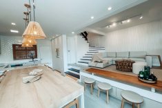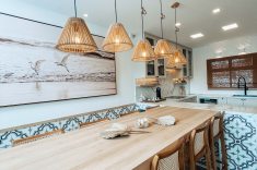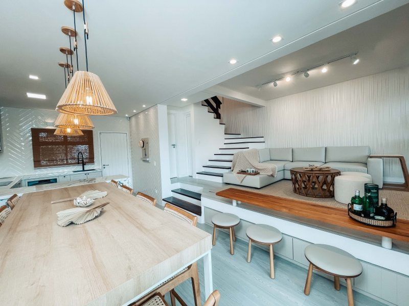 Usados em todos os ambientes e em diferentes soluções, a cozinha tem toda a bancada em porcelanato branco, enquanto a mesa de jantar, com revestimento preto, branco e cinza, protege a parede que se une à bancada-buffet com fundo de marcenaria na mesma proposta.” – afirmou a profissional. Finalizando o espaço, a grande fotografia litorânea, tirada pela própria moradora a poucos metros de distância da residência, foi combinada a pendentes de palhinha e madeira de tons claros para uma atmosfera praiana ainda mais agradável.