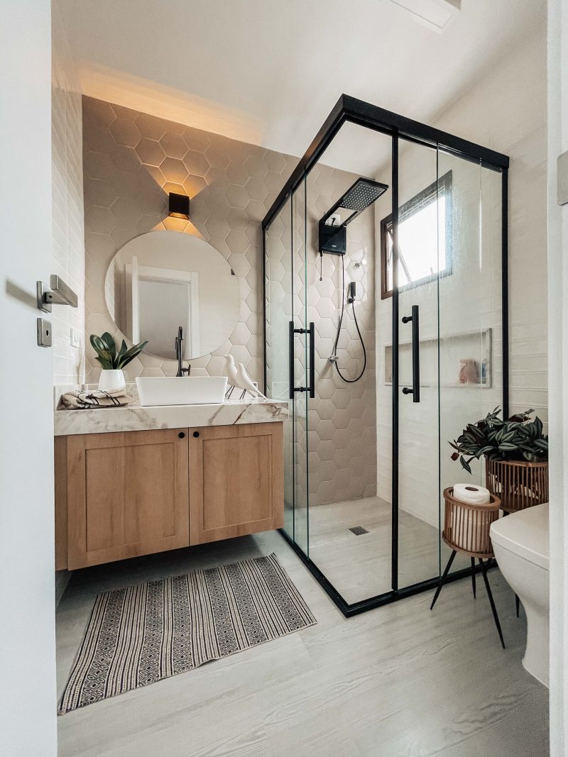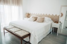 O pavimento superior também apostou no décor criativo: na suíte máster, por exemplo, a cabeceira tradicional foi substituída por um mosaico de porcelanato na mesma paleta de cores dos tecidos e do enxoval. O banheiro principal, por sua vez, foi totalmente renovado e ganhou revestimentos de paginação diferenciada, apostando no mix de peças de diferentes tamanhos para conferir personalidade única ao ambiente. O resultado, agradável e iluminado, certamente ficou “bem na foto”.