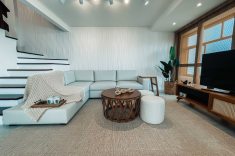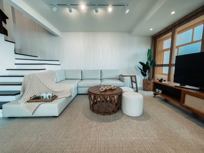 “O projeto para a casa de praia do casal Ana e Leandro foi muito desejado. Logo no briefing inicial a cliente, que é fotógrafa, pediu ambientes aconchegantes, claros, integrados e, acima de tudo, muito fotogênicos.” – afirmou a arquiteta. A paleta de base branca, com toques de cinza e preto, ganhou toques de cor a partir de materiais naturais como palhinha e madeira. Despojado e minimalista, o décor da sala de estar investiu em mobiliário clean e tecidos confortáveis valorizados pela textura tridimensional do porcelanato usado na parede de fundo.