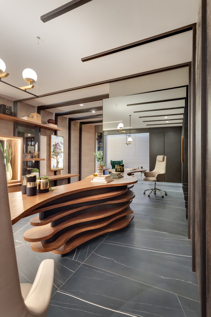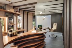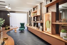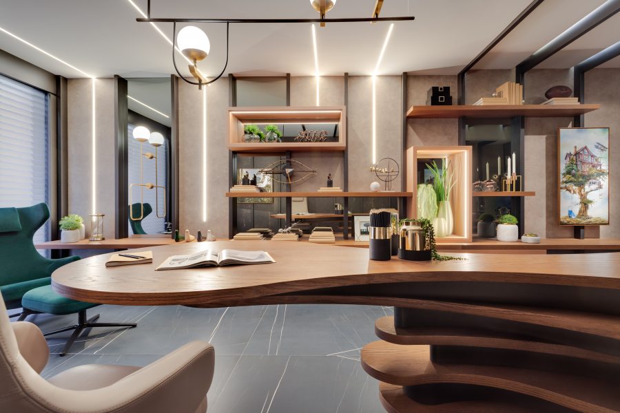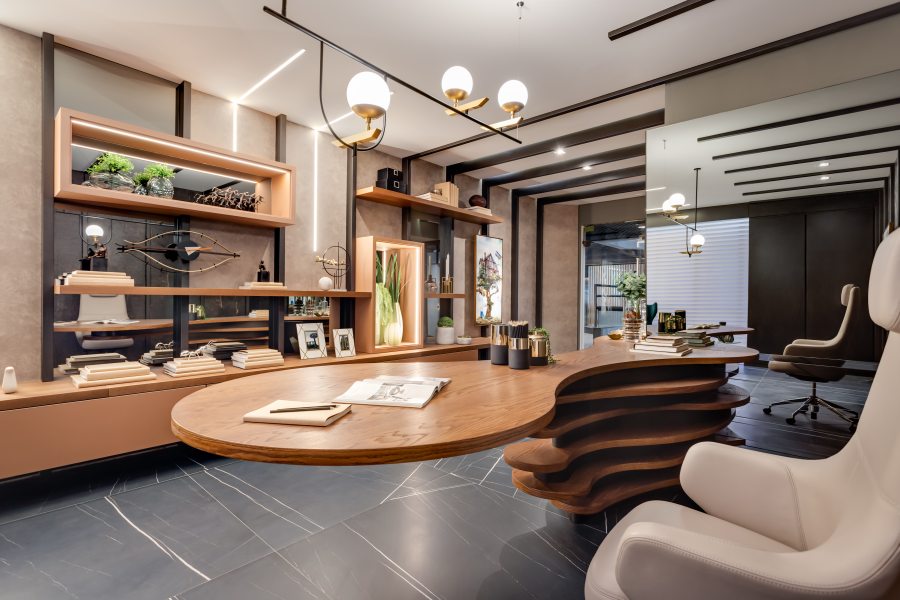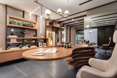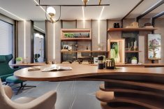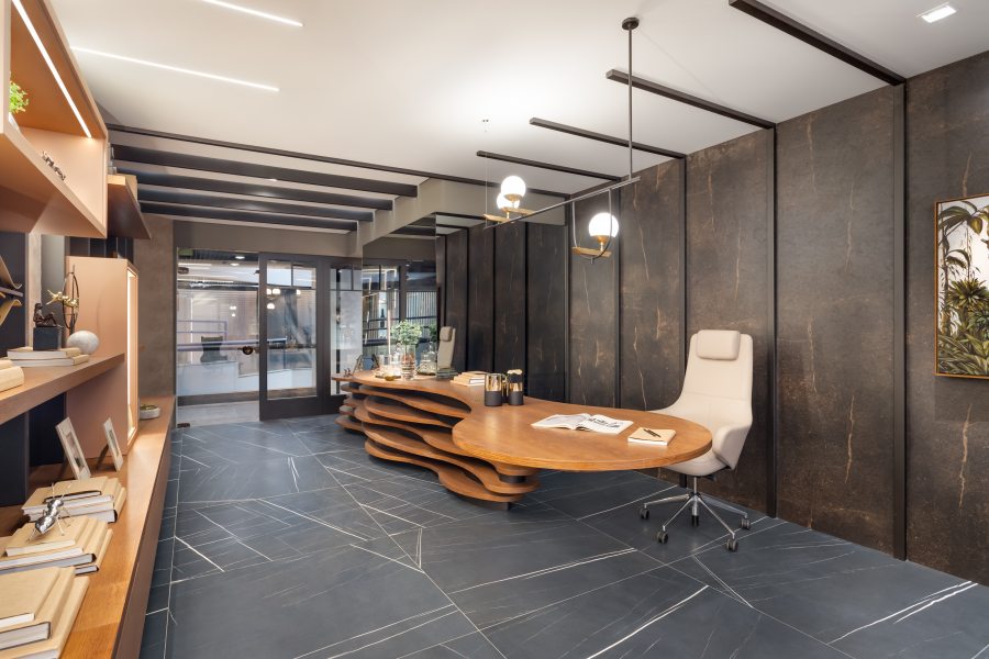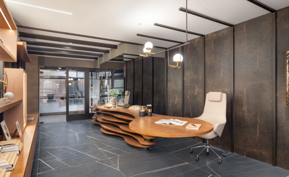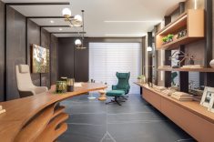 Já o Office do Empresário, ideado por Clarice Volpi, aposta na sofisticação ousada do mármore negro, tendência no décor. Contrastando com a madeira, ela optou pelas peças da linha Sahara Noir, em grande formato (120 x 120 cm). “Assim, o ambiente de quase 50 m² passa uma sensação masculina e elegante”, conta Clarice.
