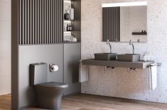 Bacia com caixa acoplada Nexo e cuba de apoio Optica, ambas na cor Onix