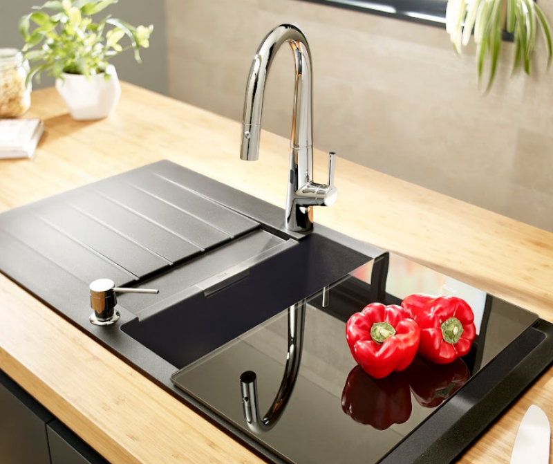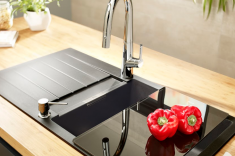 Com design sofisticado, o monocomando para cozinha de mesa Glera em L (90º) agrega modernidade e funcionalidade as bancadas. | Foto: divulgação Roca