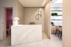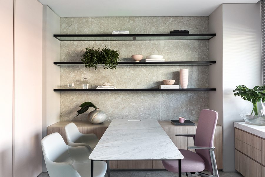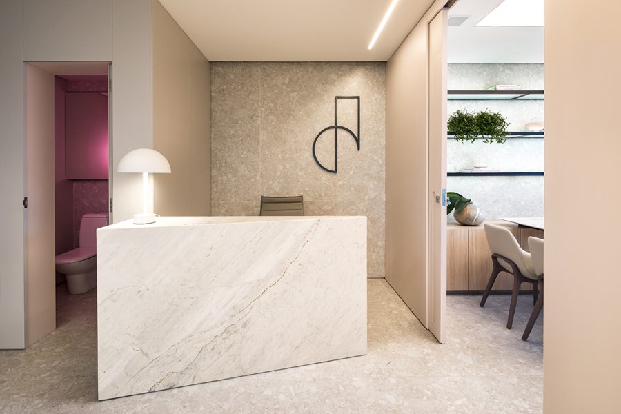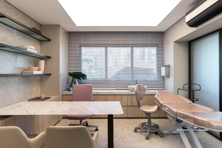 Para trazer um ar mais descontraído e menos formal, a sala de consulta conta com linhas retas no mobiliário e pontos de um tom cloro de rosa, seguindo a identidade da cliente. Com isso, o conceito contemporâneo predomina, mas graças aos elementos orgânicos proporciona uma atmosfera leve e aconchegante.