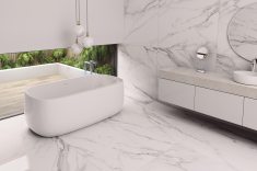 Segundo Christie, toda sala de banho pode ser valorizada com a estética do mármore, clássico e atemporal. "Em nosso portfólio, contamos com diversos porcelanatos que, através da impressão HD de mais alta tecnologia, reproduzem os veios e nuances da pedra natural, garantindo todo requinte necessário, aliado com as vantagens do material". Mais leve e fino do que uma pedra natural, o porcelanato se mostra também bastante resistente e conta com acabamentos antiderrapantes, por exemplo, capazes de aliar beleza e segurança ao espaço.