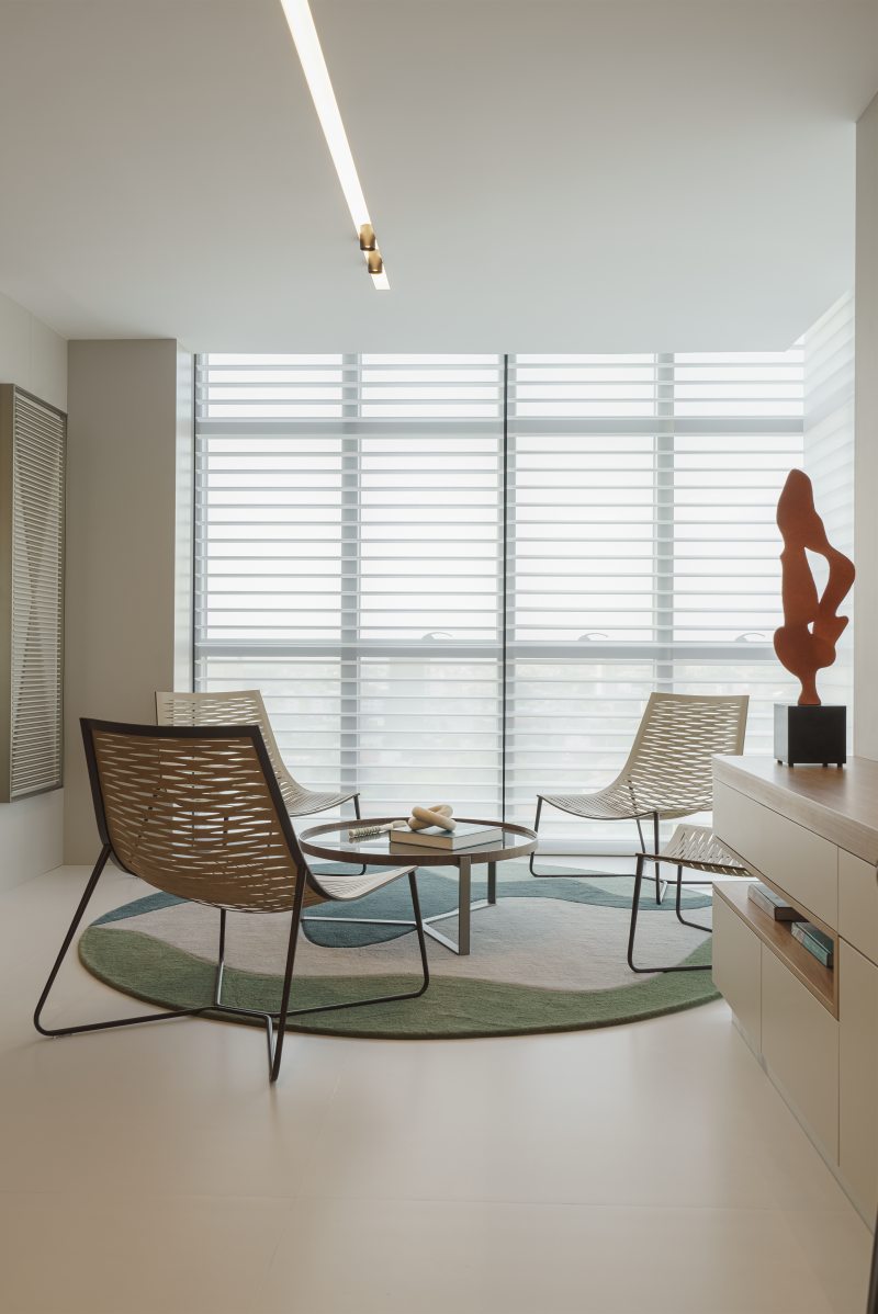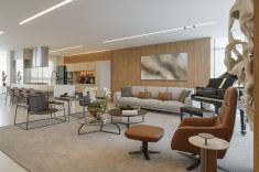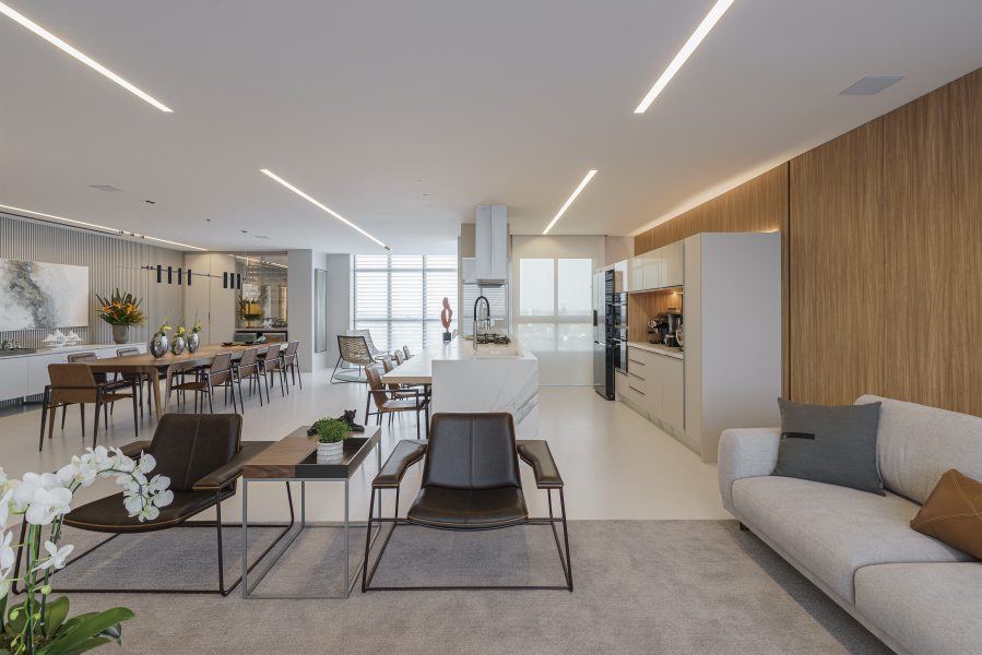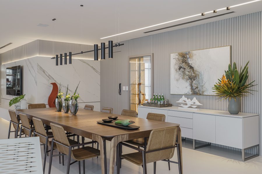 A comunicação entre os ambientes destacou a fluidez e amplitude da área social. A paleta de cores em base branca, combinada a painéis amadeirados nas paredes e portas de acesso a área íntima da residência, reforçou a elegância das peças de design contemporâneo.