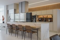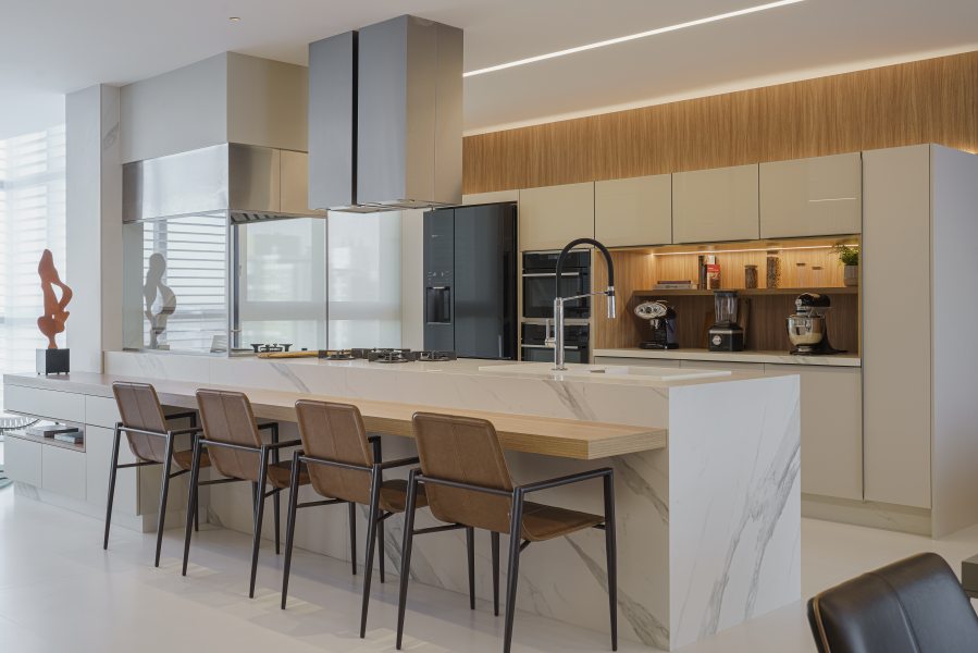 A cozinha integrada, com bancada de Dekton Branco e mobiliário sob medida, ganhou banquetas e balcão para refeições rápidas no dia a dia. A sala de jantar, em tons de cinza claro, combinou a mesa de nogueira às cadeiras Musa, em couro caramelo e lâmina de carvalho marrom.