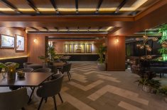 As arquitetas paranaenses Juliane Gasparin, Mariana Marchiori e Tatyana Muller assinam o espaço "The Pub: Do Jazz ao Rock" na CasaCor SC/Itapema 2018. Definido como “urbano tropical”, o ambiente conta com linhas contemporâneas misturadas com toques tradicionais, visto no uso do couro capionê e tijolinhos aparentes, elemento visual comum nos pubs ingleses.