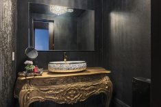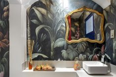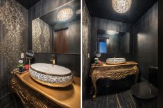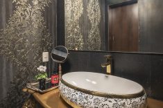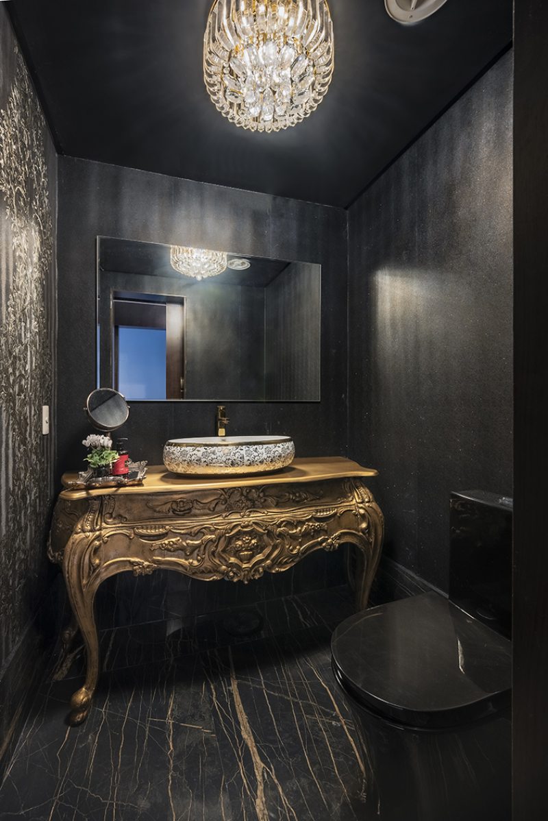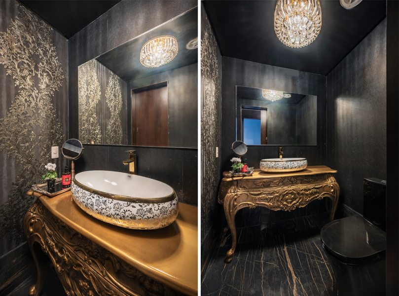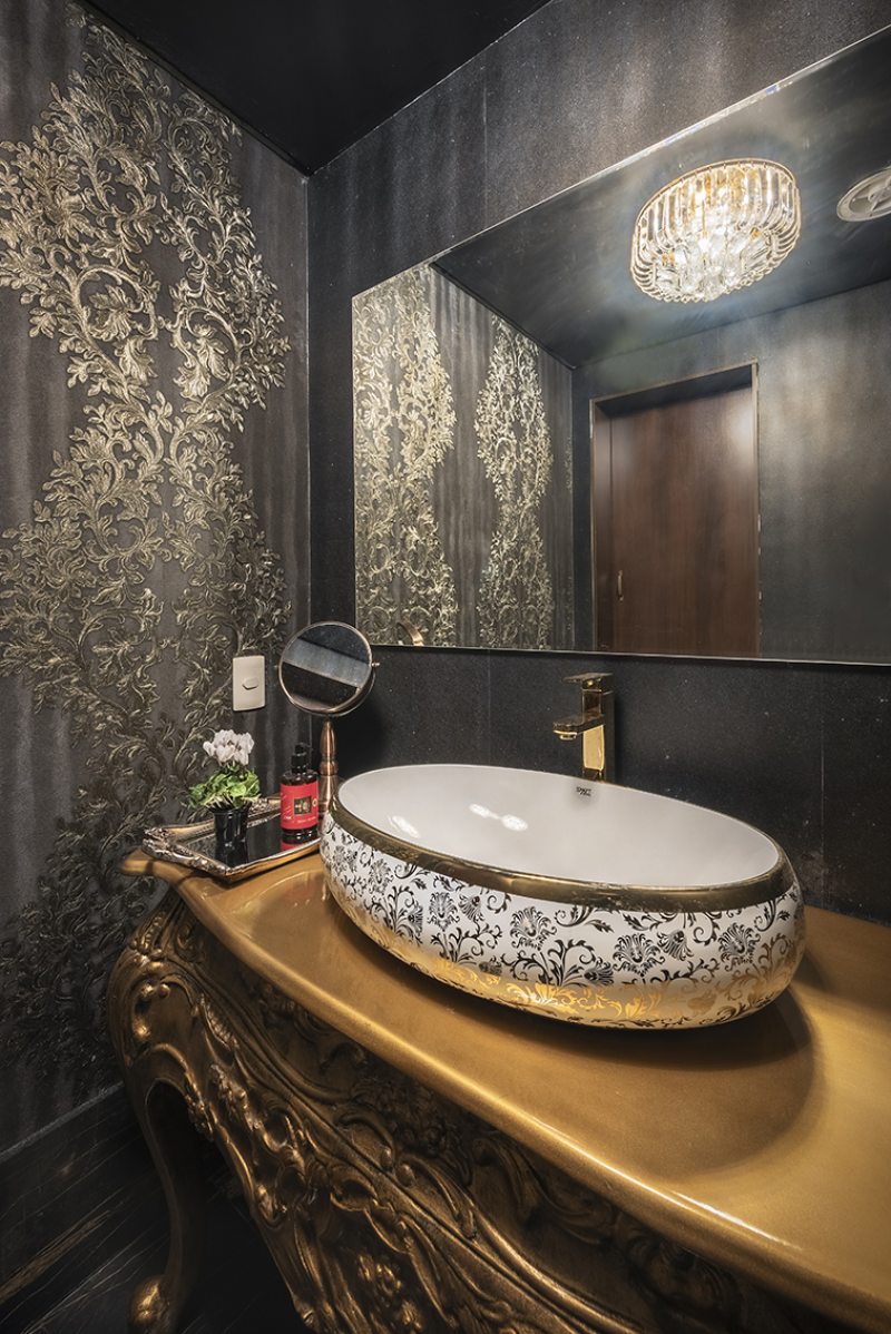 Um exemplo é o lavabo preto que enaltece a confluência entre o contemporâneo, o clássico e o barroco, assinado por ele e sua sócia, a arquiteta Priscila Tressino. Arabescos dourados ornamentam a parede com fundo escuro e o móvel dourado que foi a base eleita para receber a cuba de apoio de cerâmica, ornamentada por florais.