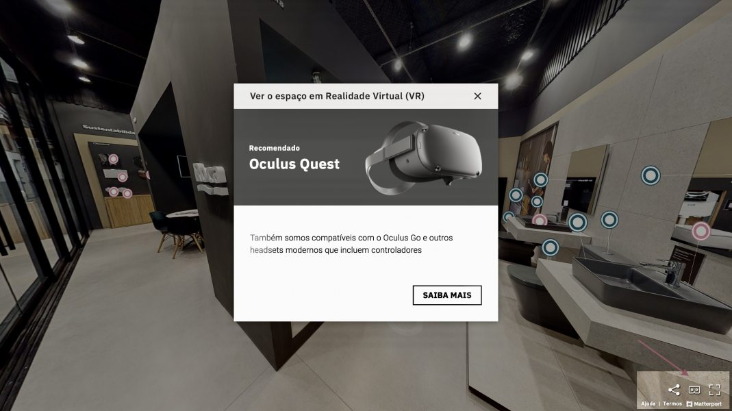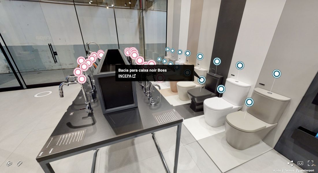 Por meio de uma plataforma de acesso simplificado, é possível percorrer todo o showroom e conferir de perto os detalhes dos produtos, que contam com uma tag com o nome de cada um e um link que direciona à página com especificações, detalhes, cores e formatos disponíveis. Separado por ambientes, como banheiro e cozinha, os espaços ainda contam com formatos de mediação e VR, em que é possível se “teletransportar” ao showroom via óculos de realidade aumentada.