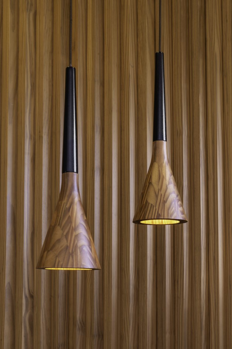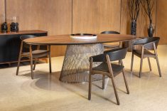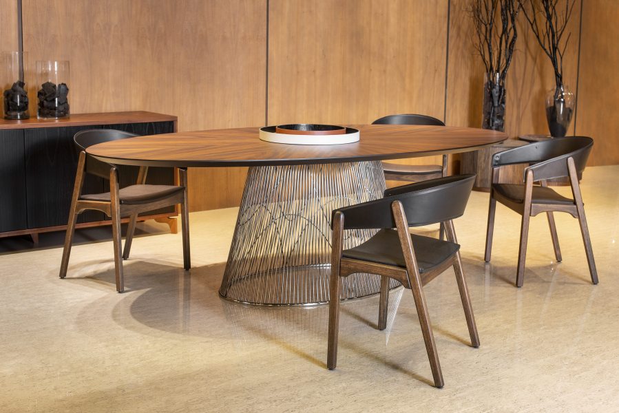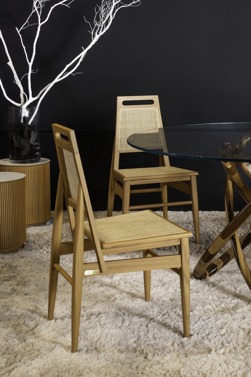Acima: Mesa de jantar e cadeiras que compõem a linha Soul, feitos de madeira maciça (elemento marcante do design autoral da marca). Confira mais imagens em nossa galeria!