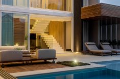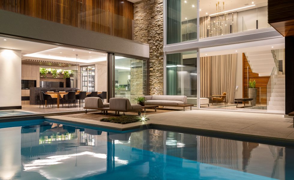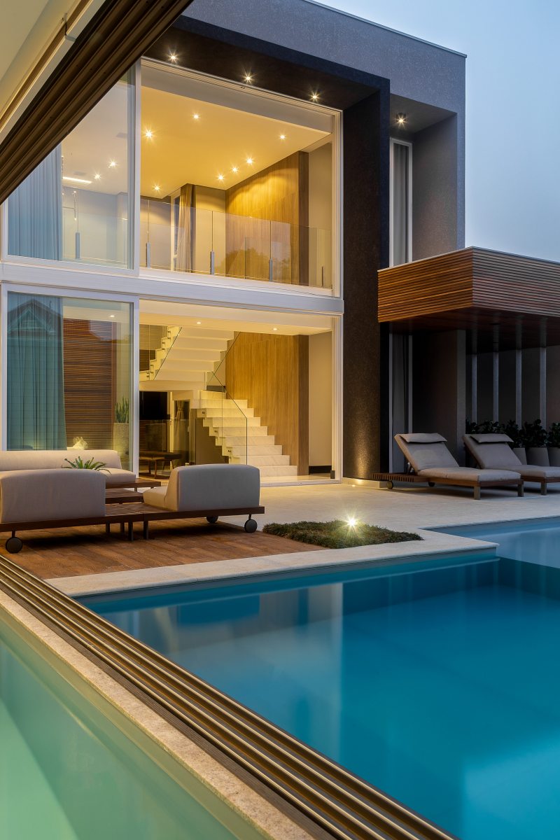 Para que a conexão dentro e fora da casa ficasse ainda mais evidente, o arquiteto utilizou a piscina como elemento principal: “Queríamos que a piscina entrasse dentro de casa e unir uma piscina interna com uma externa é uma tarefa tecnicamente difícil. Por isso, optamos pela Desjoyaux, que além de solucionar a questão técnica com perfeição, trouxe beleza e funcionalidade para o projeto. Foi uma excelente escolha”, elogia Maximiliano.