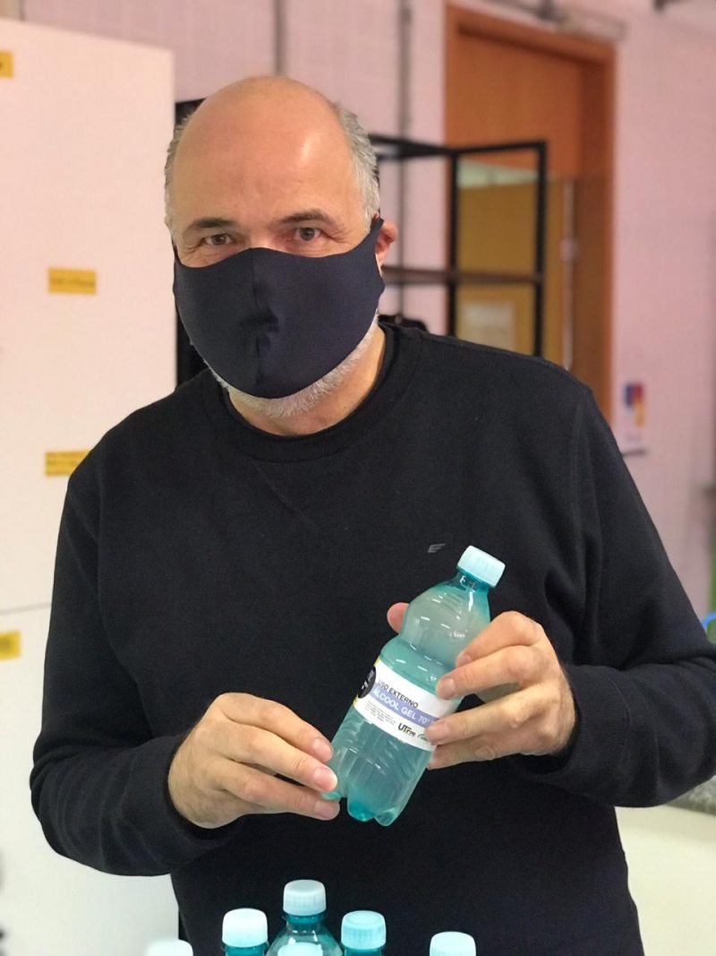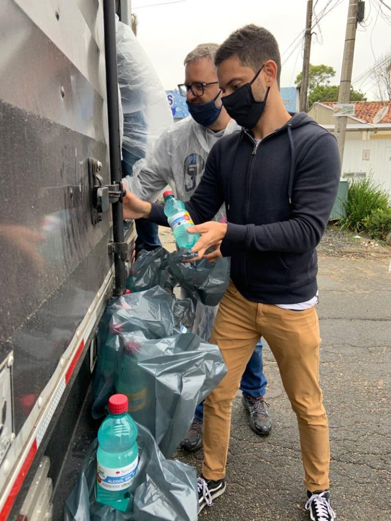 Mais uma história inspiradora sobre solidariedade em tempos de pandemia! Em uma das ações de distribuição das cestas básicas arrecadadas pela iniciativa Juntos Somos Mais (coletivo que reúne mais de 3800 profissionais voluntários de arquitetura e decoração de todo o país) a arquiteta Caroline Bollman se deparou com uma cena que lhe chamou a atenção: um dos voluntários incluía, junto com cada doação, uma garrafinha plástica sem rótulo contendo um gel transparente. Conversando com o voluntário a arquiteta descobriu se tratar do professor Fernando Molin, chefe do departamento de química da UTFPR: para colocar seu conhecimento a serviço da população ele havia tomado a iniciativa de incluir frascos de álcool-gel nas cestas básicas doadas às comunidades vulneráveis.