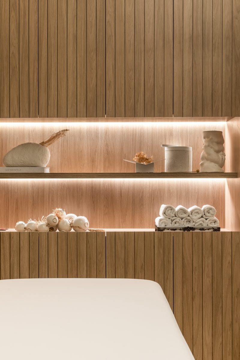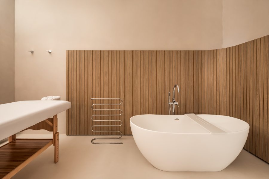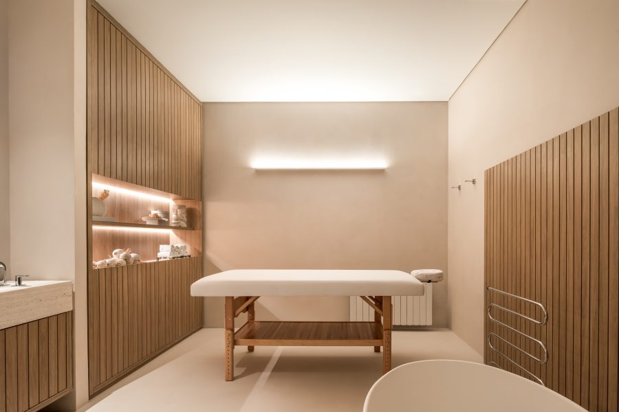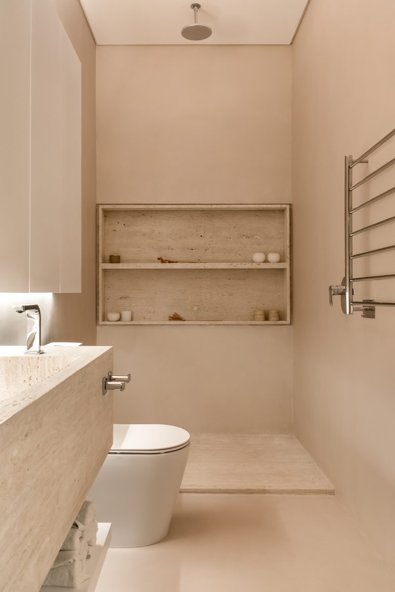 "Contemplação, satisfação e relaxamento foram conceitos que inspiraram todas as decisões projetuais. Combinamos linhas orgânicas a uma estética minimalista composta por três materiais principais: o microcimento areia, painéis de madeira natural e revestimentos de mármore travertino." -afirmou o arquiteto.