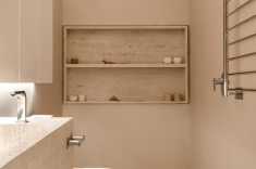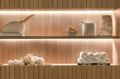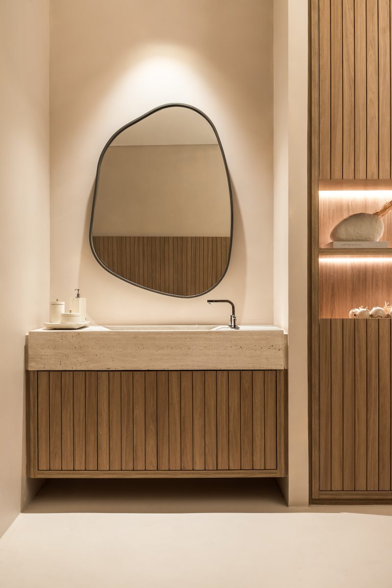 O microcimento cobriu praticamente todas as superfícies do ambiente, do chão às paredes. A tonalidade acolhedora do material, combinada aos painéis de madeira e à marcenaria sob medida, ajudou a criar a atmosfera relaxante idealizada para o projeto. As cubas e nichos de mármore travertino adicionaram textura às superfícies, complementando o acabamento ripado dos painéis de madeira.