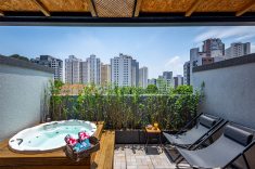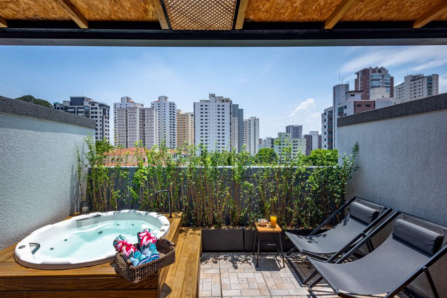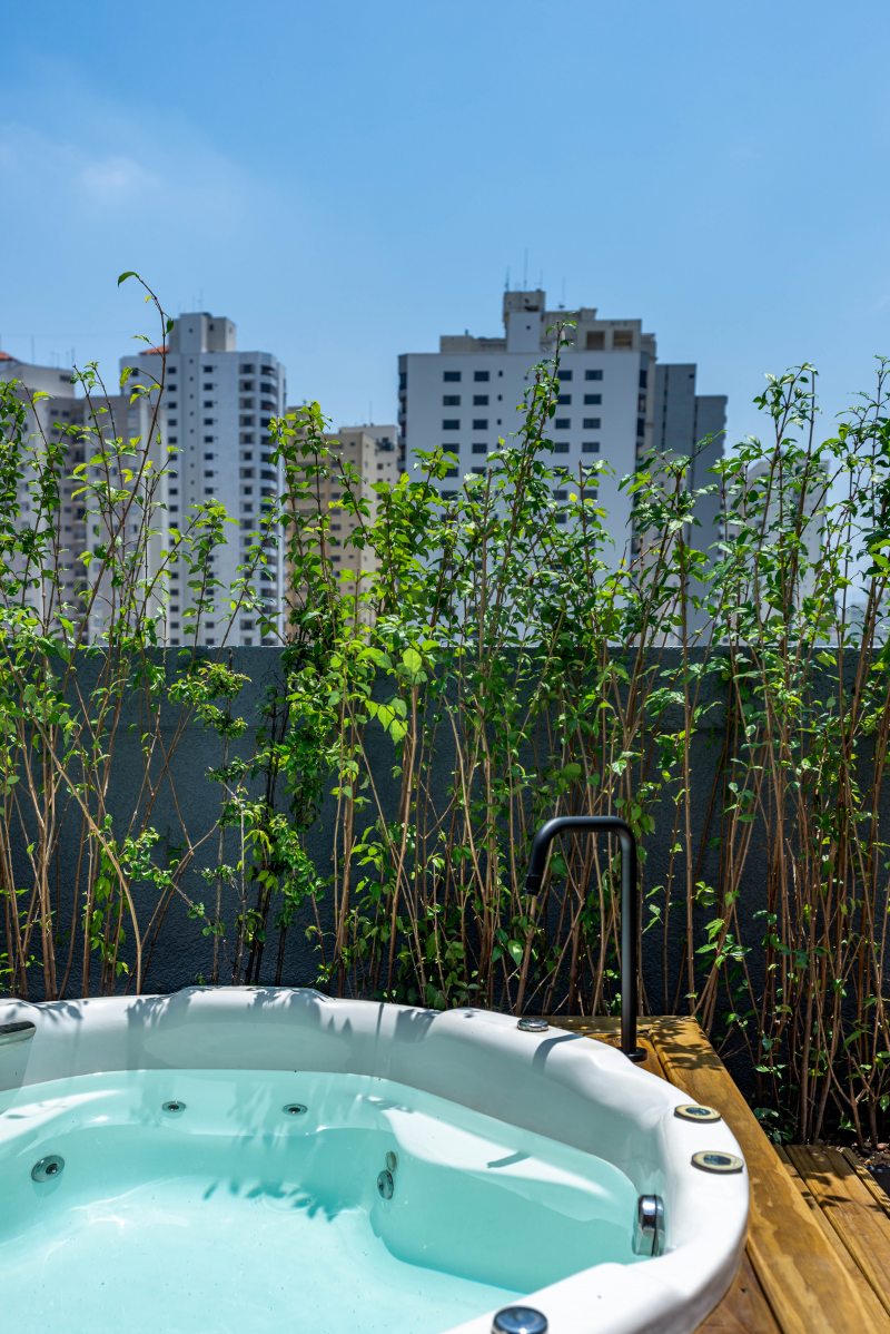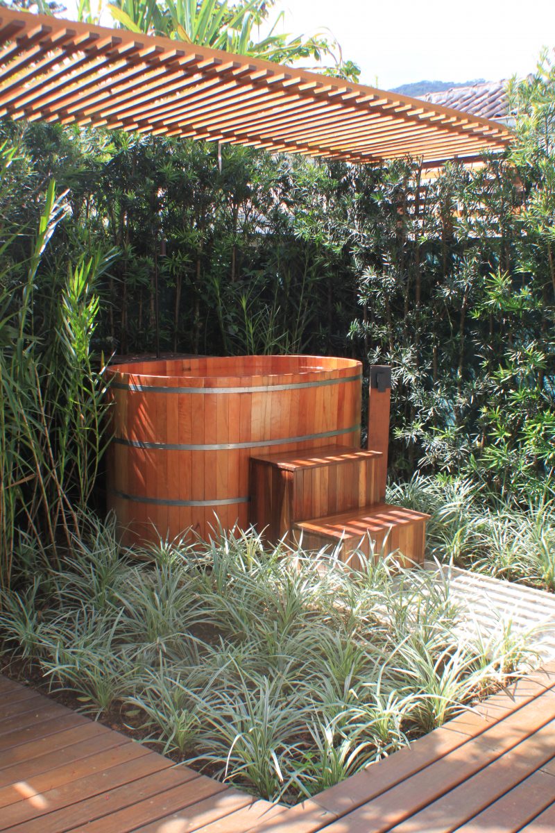 Acima: Nesse projeto, Cezar Scarpato optou por um ofurô, criando um cantinho de relaxamento e contemplação.