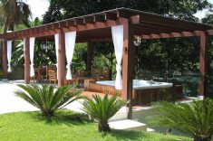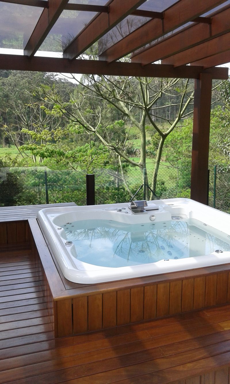 Acima: Integrado com a área de lazer, esse spa projetado por Cezar Scarpato ganhou um pergolado de madeira, que protege a hidromassagem.