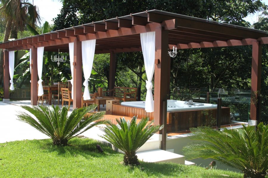 Acima: O deck de madeira abriga a hidromassagem, nesse projeto de Cezar Scarpato. Para relaxar em qualquer estação, o cantinho ganhou também uma cobertura pergolada. Foto: Bicubico