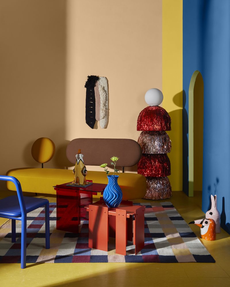 Ambiente que materializa A EmpolgadaSofá @estudiobiarezende; luminária @cultivadoemcasa; tapeçaria @_alexrocca; mesas @f.studio_design; sobre elas, escultura @andremenezesart2 e vaso @atelier.recul, ambos na @feiranarosenbaum; cadeira @_formabruta;tapete @koord_; vasos (no chão) @ceraminquinho na @feiranarosenbaum; pisos @tarkettbrasil